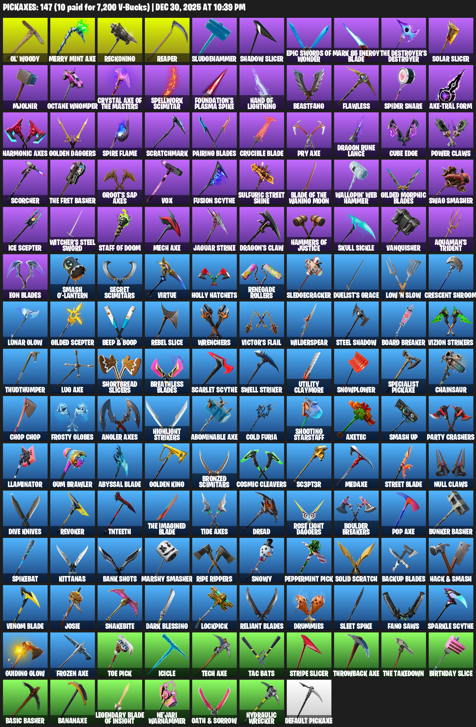 Merry Mint Axe, Ol’ Woody, Reckoning, Reaper, Sludgehammer, Shadow Slicer, Mark 85 Energy Blade, Mjolnir, Octane Whomper, Spellwork Scimitar, Foundation’s Plasma Spike, Hand of Lightning, Beastfang, Flawless, Spider Snare