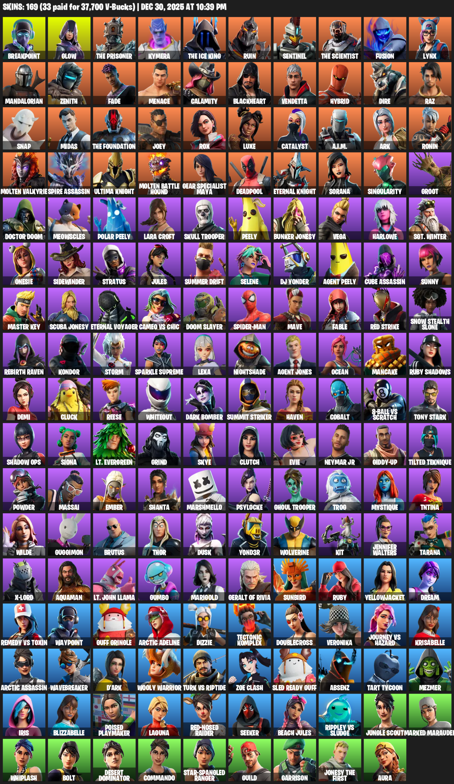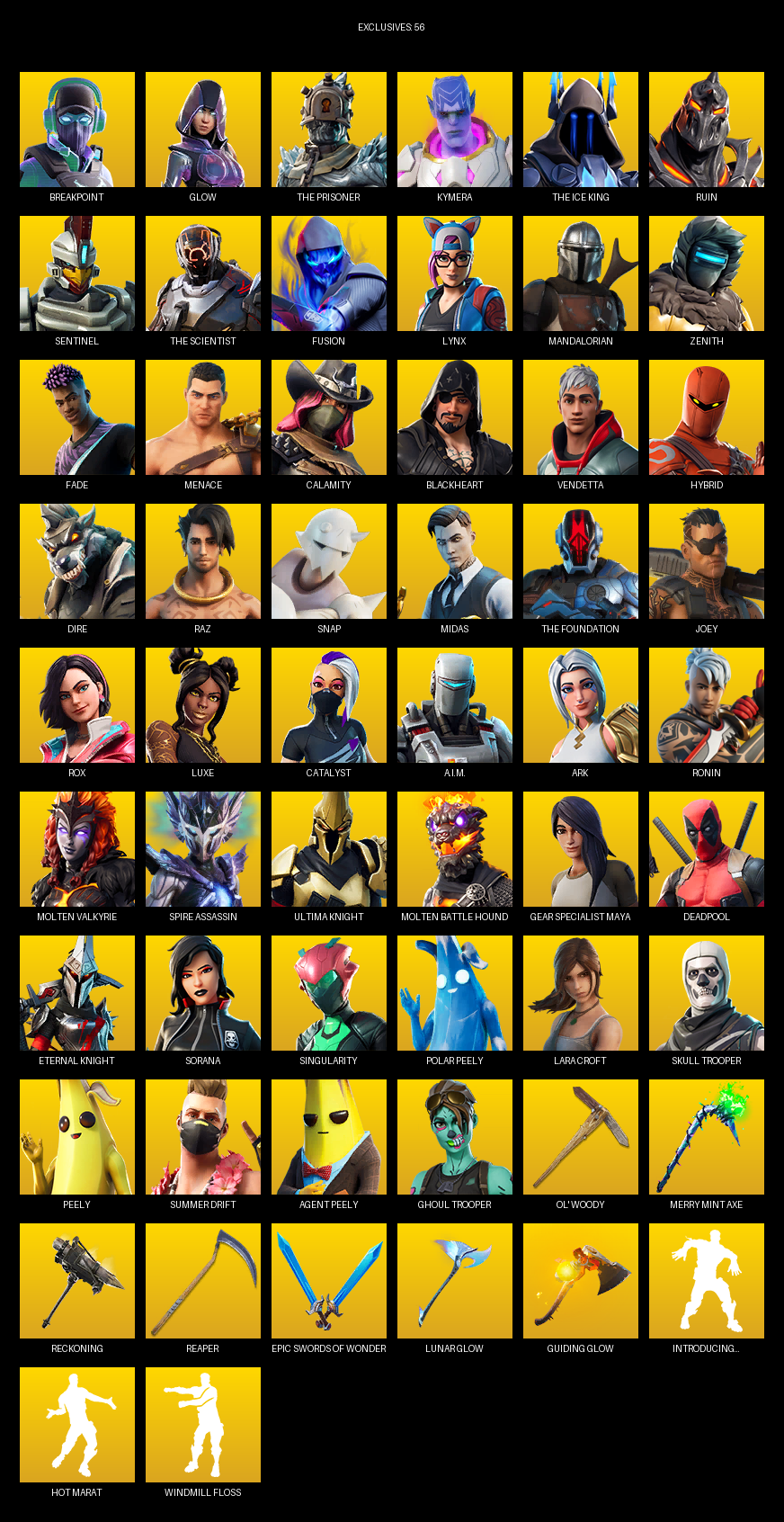 Gear Specialist Maya, Lara Croft, Breakpoint, Glow, The Prisoner, Kymera, Ruin, Sentinel, Fusion, Lynx, Mandalorian, Zenith, Fade, Menace, Calamity, Blackheart, Vendetta, Hybrid