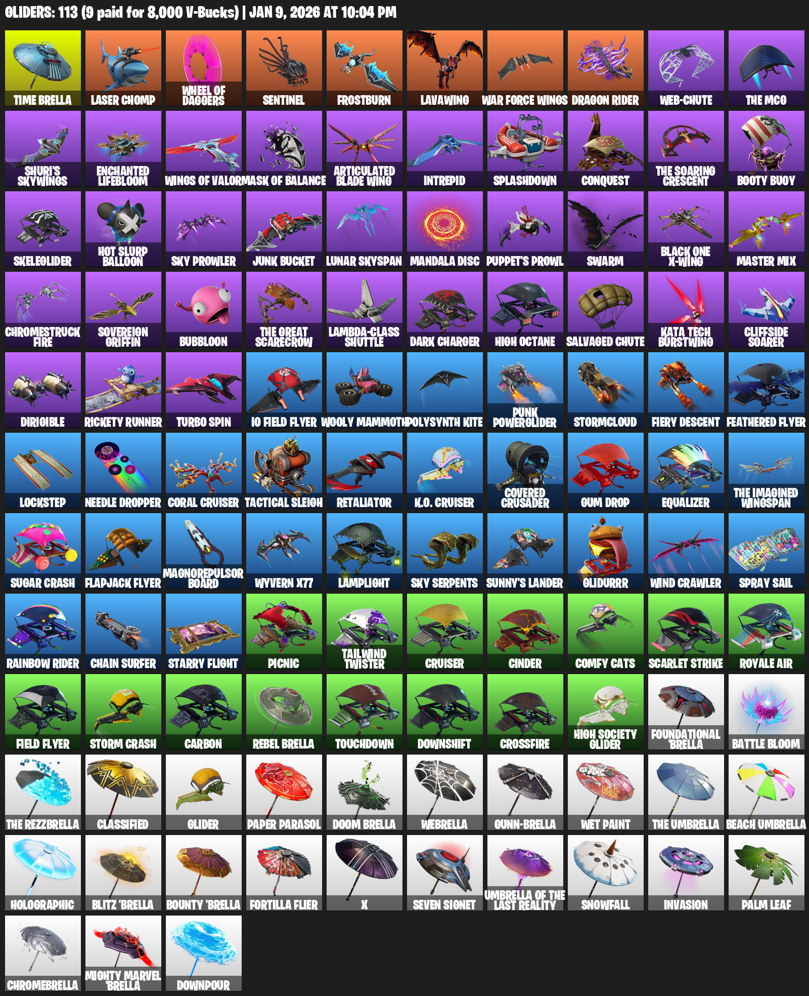 Time Brella, Laser Chomp, Sentinel, Frostburn, Lavawing, War Force Wings, Web-Chute, Shuri’s Skywings, Enchanted Lifebloom, Mask of Balance, Articulated Blade Wing, Intrepid, Splashdown, Conquest, Booty Buoy