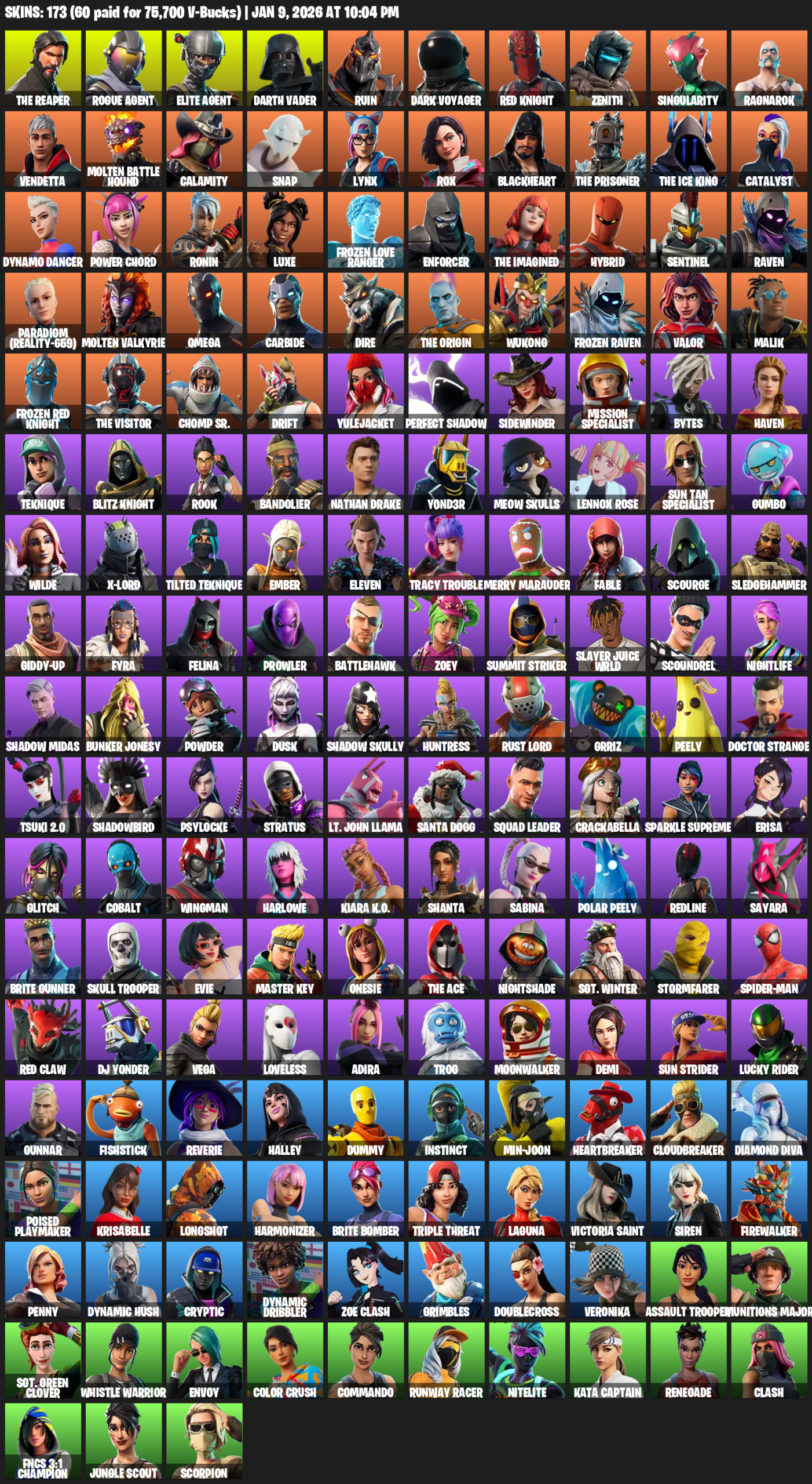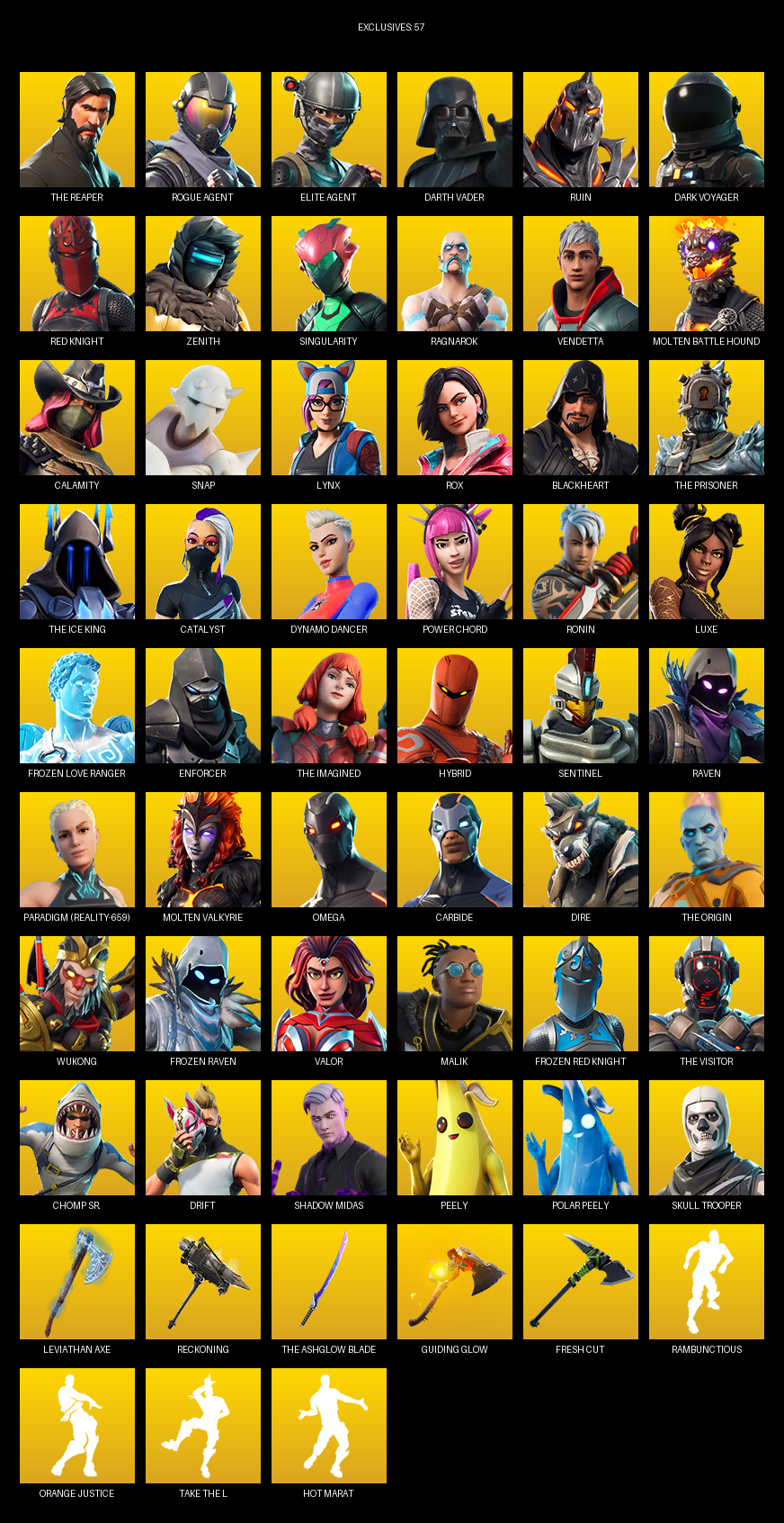 The Reaper, Elite Agent, Omega, Darth Vader, Ruin, Dark Voyager, Red Knight, Zenith, Singularity, Ragnarok, Vendetta, Molten Battle Hound, Calamity, Snap, Lynx, Rox, Blackheart