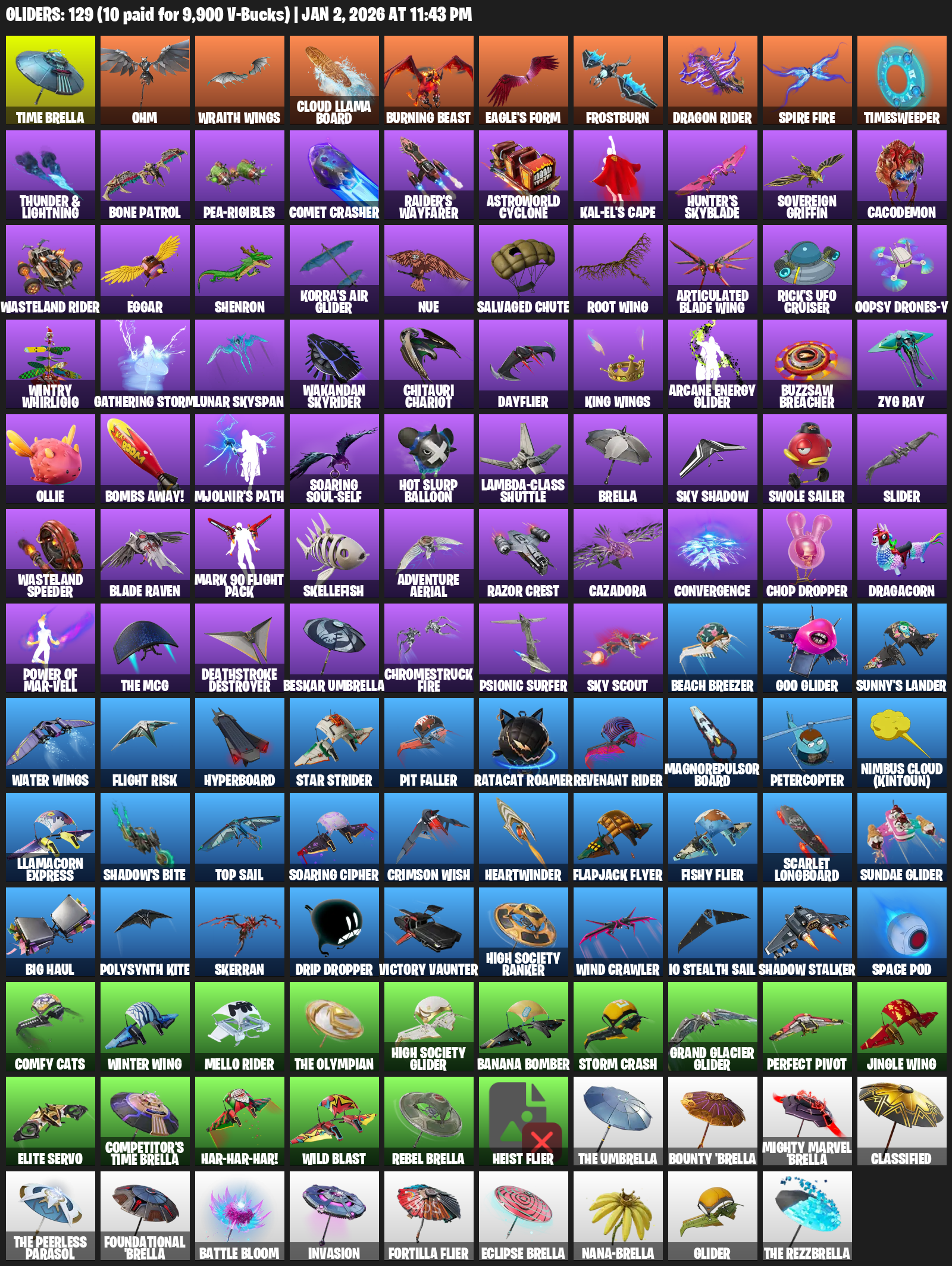 Time Brella, Ohm, Wraith Wings, Cloud Llama Board, Burning Beast, Eagle’s Form, Frostburn, Spire Fire, Timesweeper, Thunder & Lightning, Bone Patrol, Pea-rigibles, Comet Crasher, Raider’s Wayfarer, Astroworld Cyclone, Kal-El’s Cape, Hunter’s Skyblade, Sovereign Griffin, Cacodemon