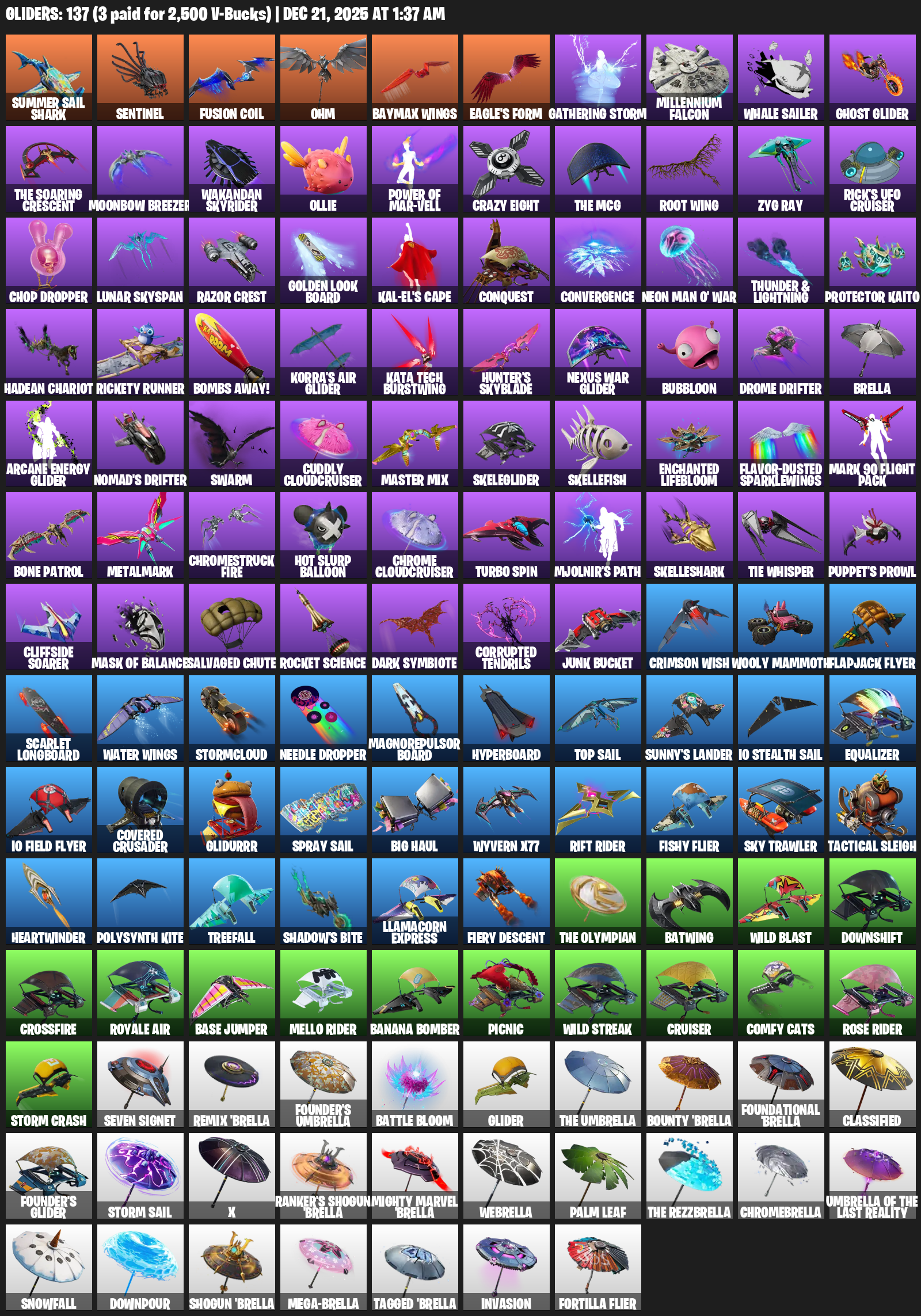 Summer Sail Shark, Ohm, Baymax Wings, Eagle’s Form, Gathering Storm, Millennium Falcon, Whale Sailer, Ghost Glider, Moonbow Breezer, Ollie, Crazy Eight, Root Wing, Zyg Ray, Rick’s UFO Cruiser