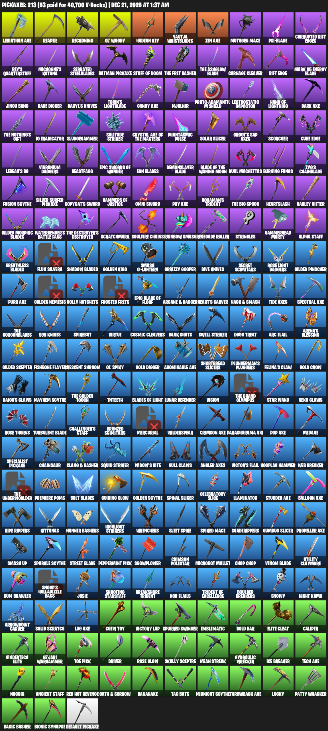 Leviathan Axe, Reaper, Reckoning, Ol’ Woody, Hadean Key, Yautja Wristblades, Mutagen Mace, Psi-blade, Corrupted Rift Edges, Rey’s Quarterstaff, Michonne’s Katana, Serrated Steelblades, Batman Pickaxe, Staff of Doom, Carnage Cleaver