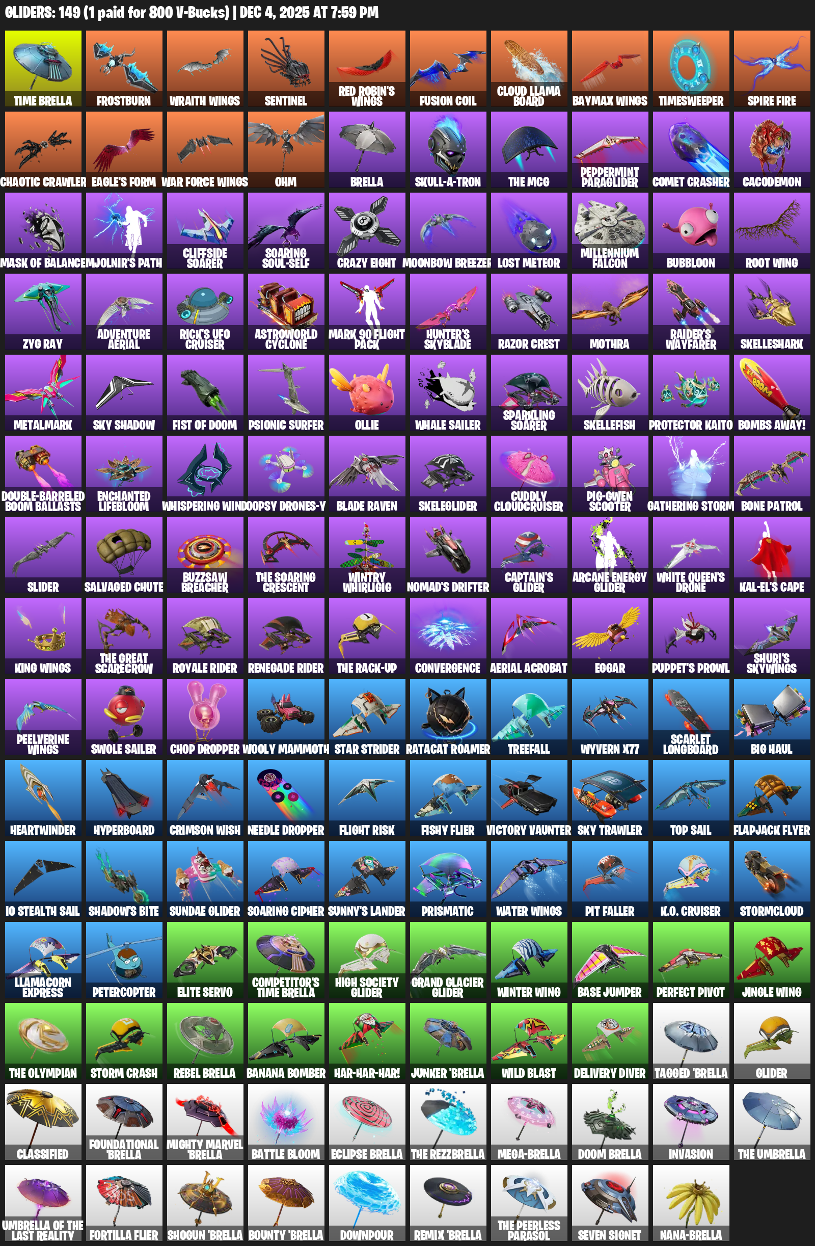 Time Brella, Frostburn, Wraith Wings, Sentinel, Cloud Llama Board, Timesweeper, Chaotic Crawler, Ohm, Peppermint Paraglider, Comet Crasher, Cacodemon