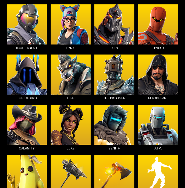 Travis Scott, Point Patroller, Gear Specialist Maya, Lara Croft, Astro Jack, Neo Versa, Kratos, Trilogy, Darth Vader, Nezumi, The Foundation, Raz, Eternal Knight, Malik, Galaxia, Peter Griffin, Valeria