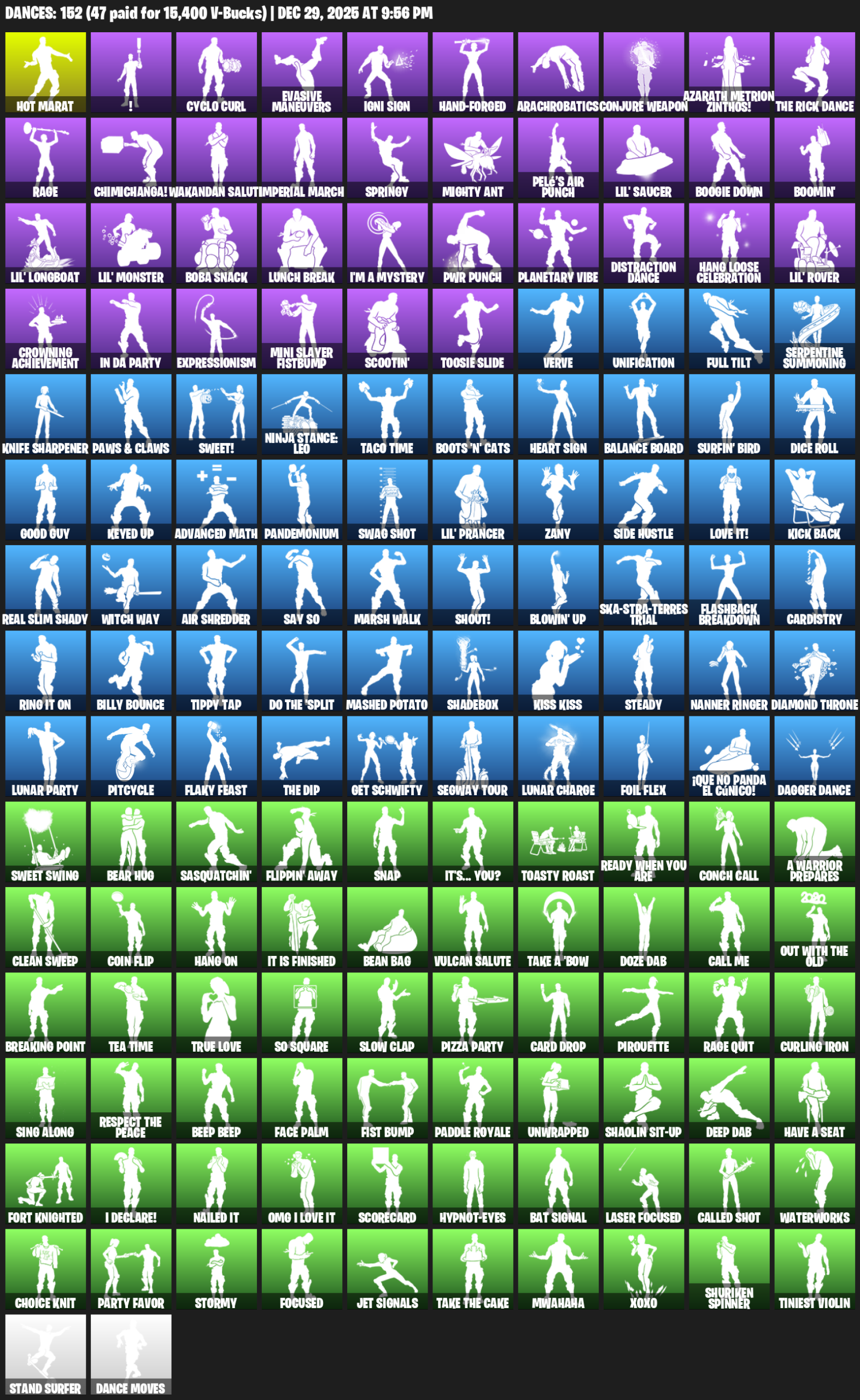 Hot Marat, !, Cyclo Curl, Evasive Maneuvers, Igni Sign, Hand-Forged, Arachrobatics, Conjure Weapon, Azarath Metrion Zinthos!, Rage, Chimichanga!, Wakandan Salute, Imperial March, Springy, Mighty Ant, Pelé’s Air Punch, Lil’ Saucer, Boogie Down, Boomin’