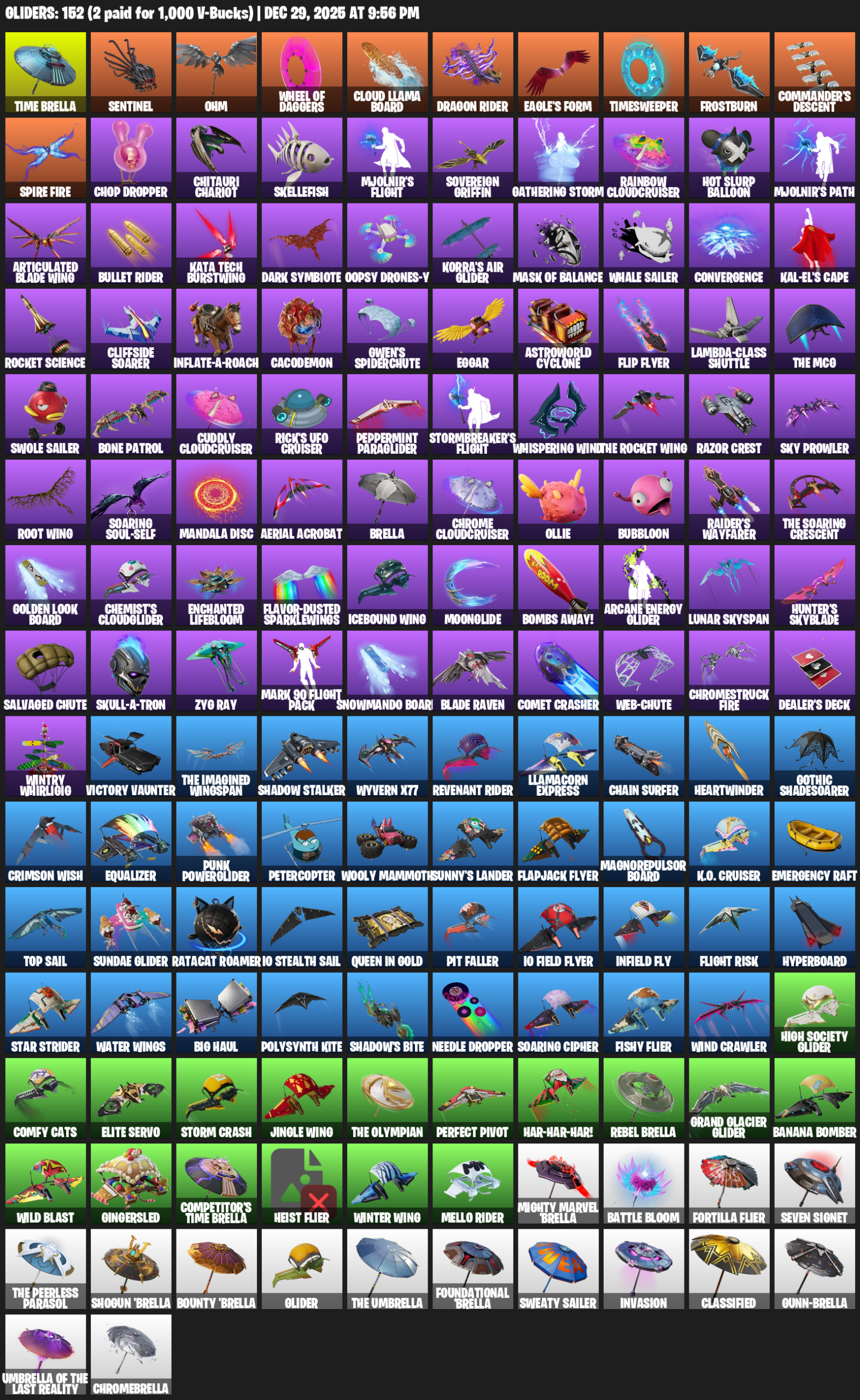 Time Brella, Sentinel, Ohm, Cloud Llama Board, Dragon Rider, Eagle’s Form, Timesweeper, Frostburn, Commander’s Descent, Chop Dropper, Chitauri Chariot, Skellefish, Mjolnir’s Flight, Gathering Storm, Rainbow Cloudcruiser