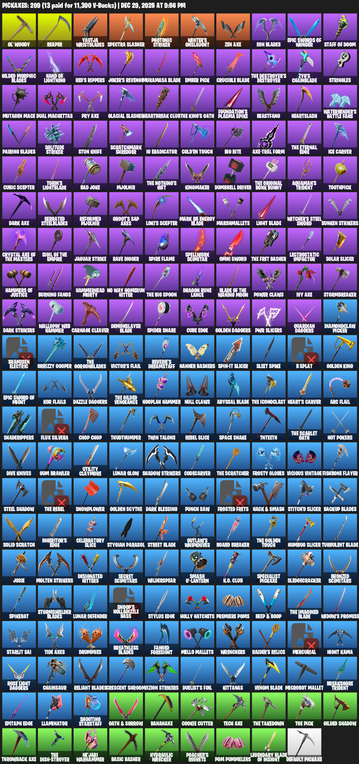 Ol’ Woody, Reaper, Yautja Wristblades, Spectra Slasher, Photonic Striker, Winter’s Onslaught, Zen Axe, Eon Blades, Staff of Doom, Red’s Rippers, Joker’s Revenge, Muramasa Blade, Ember Pick, Zyg’s Chainblade, Stringles