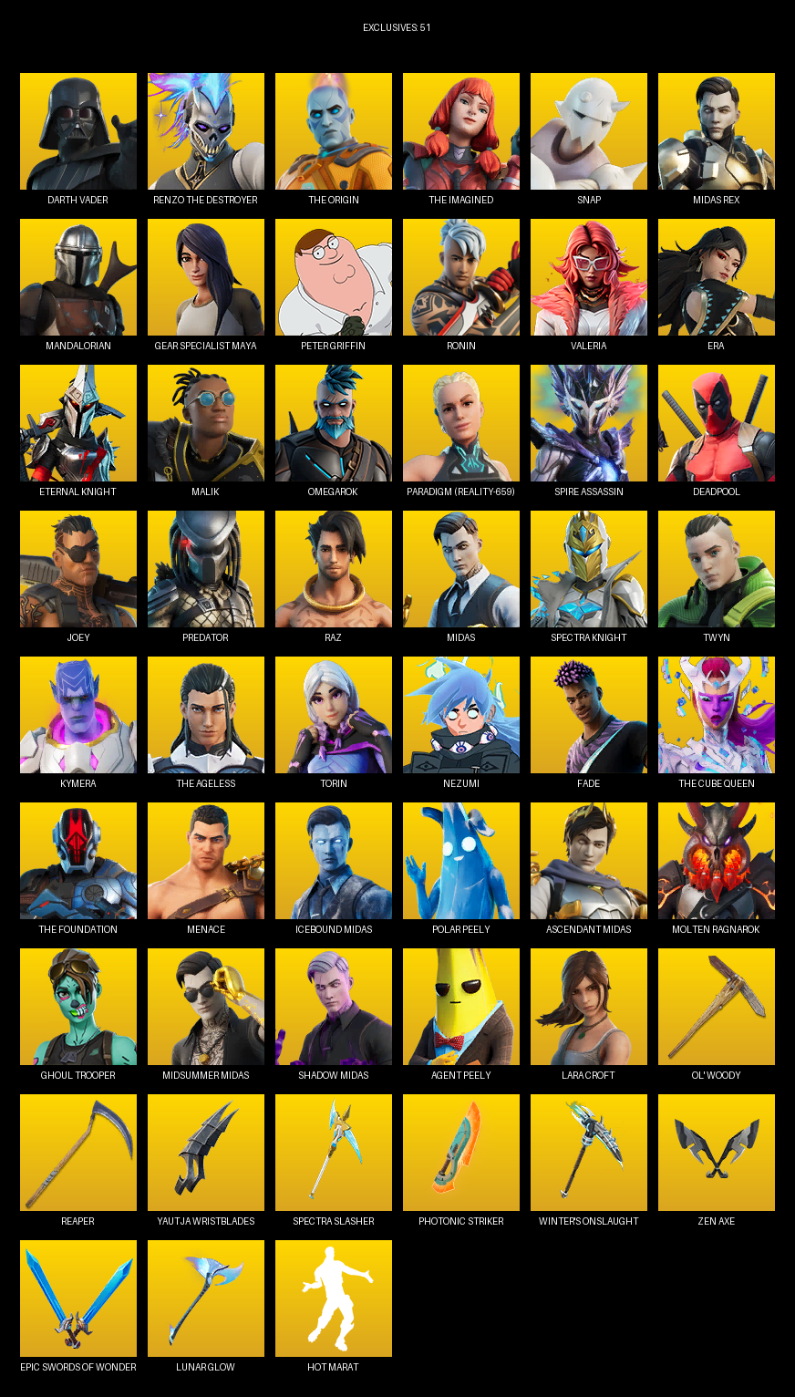 Gear Specialist Maya, Lara Croft, Darth Vader, Renzo the Destroyer, Snap, Midas Rex, Mandalorian, Peter Griffin, Ronin, Valeria, Era, Eternal Knight, Malik, Omegarok, Paradigm (Reality-659), Spire Assassin, Deadpool, Joey