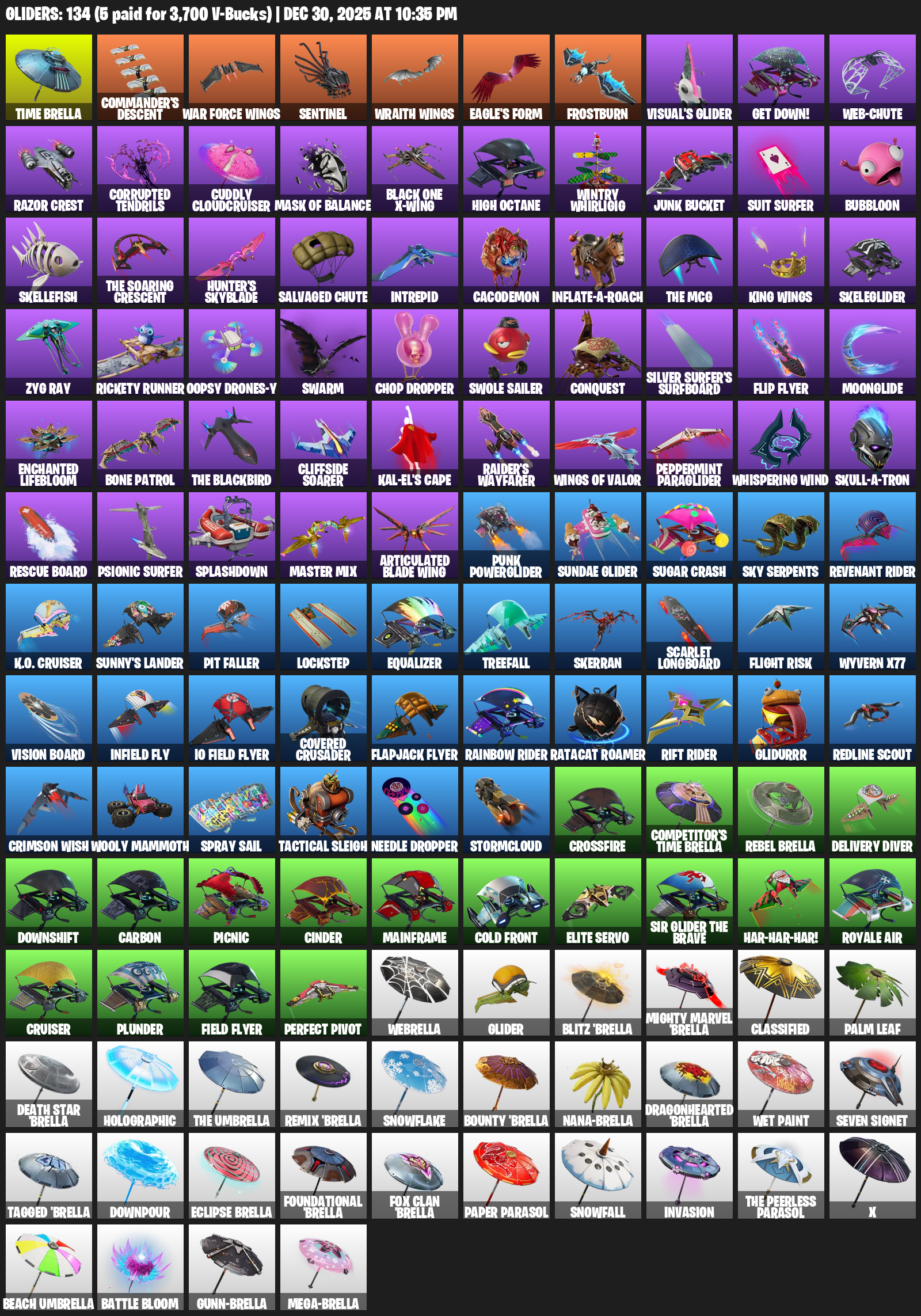 Time Brella, Commander’s Descent, War Force Wings, Sentinel, Eagle’s Form, Frostburn, Visual’s Glider, Get Down!, Web-Chute, Razor Crest, Corrupted Tendrils, Cuddly Cloudcruiser, Mask of Balance, Black One X-wing, High Octane, Wintry Whirligig, Junk Bucket, Suit Surfer, Bubbloon