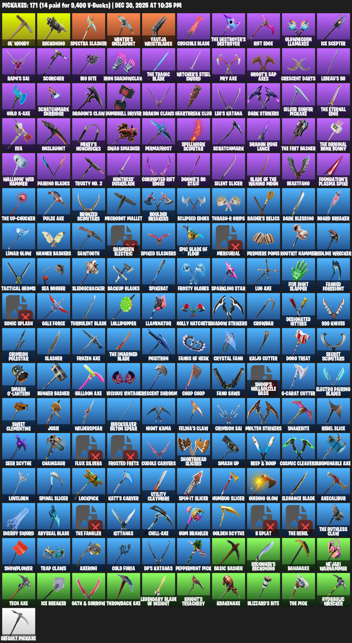 Ol’ Woody, Reckoning, Spectra Slasher, Winter’s Onslaught, Yautja Wristblades, Crucible Blade, Rift Edge, Glownicorn Llamaxes, Ice Scepter, Raph’s Sai, Scorcher, Big Bite, Iron Shadowclaw, Witcher’s Steel Sword, Pry Axe, Groot’s Sap Axes, Crescent Darts, LeBeau’s Bo
