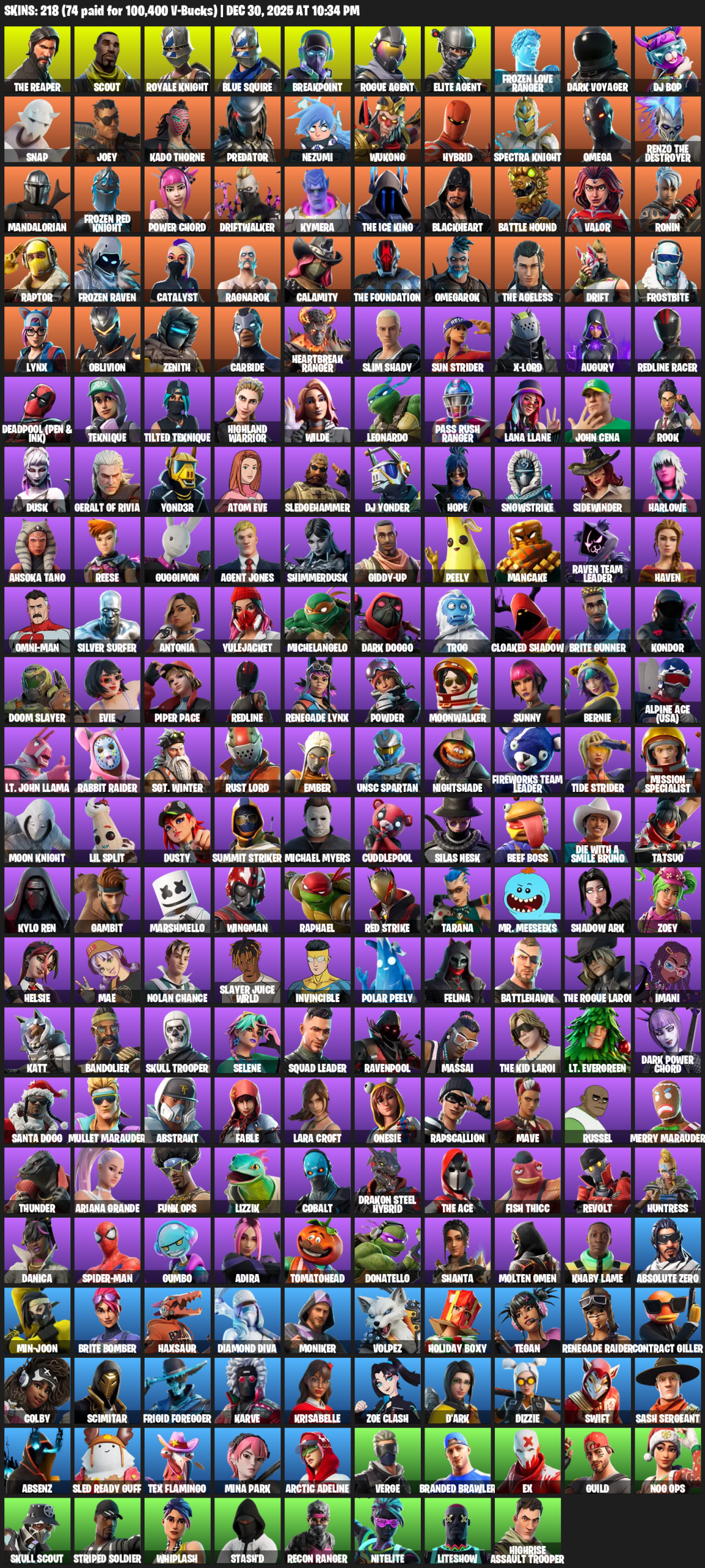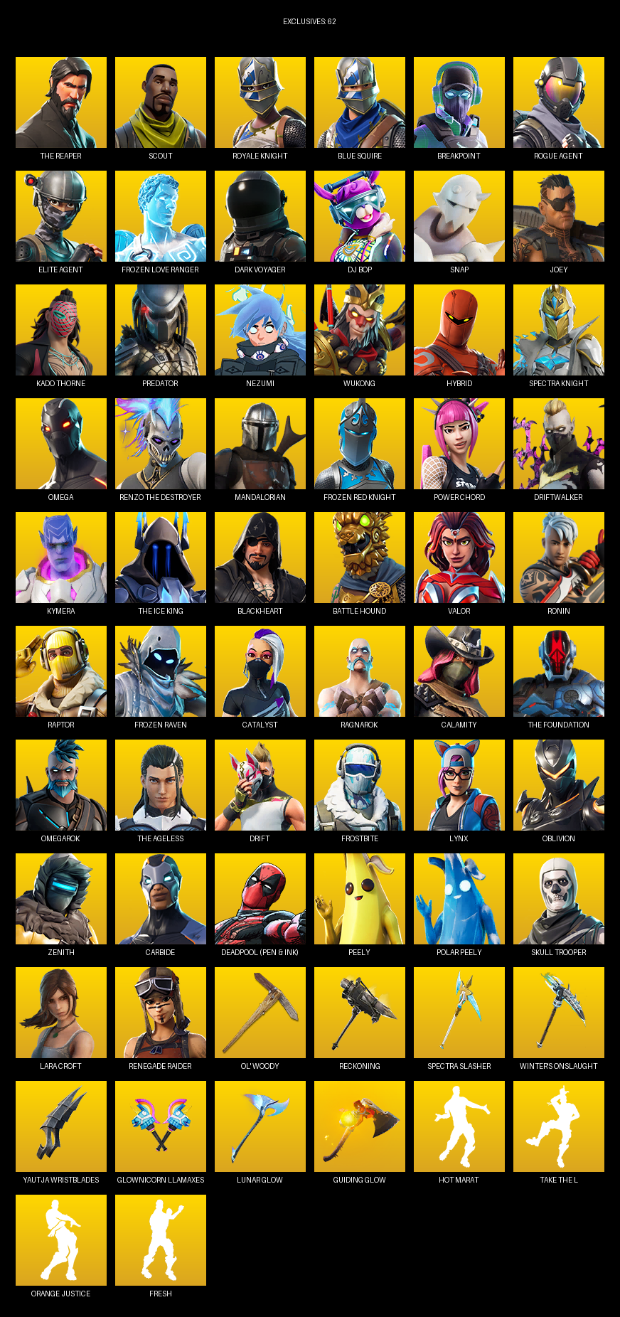 The Reaper, Royale Knight, Blue Squire, Elite Agent, Omega, Lara Croft, Renegade Raider, Scout, Breakpoint, Frozen Love Ranger, Dark Voyager, DJ Bop, Snap, Joey, Kado Thorne, Predator, Nezumi, Wukong, Hybrid