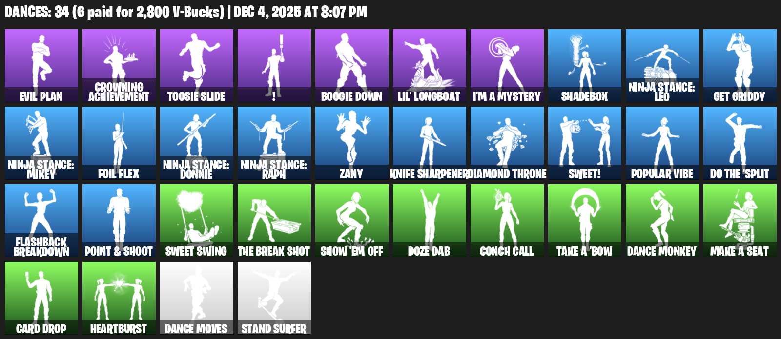 Evil Plan, Crowning Achievement, Toosie Slide, !, Boogie Down, Lil’ Longboat, I’m a Mystery, Shadebox, Ninja Stance: Leo, Get Griddy, Zany, Diamond Throne, Sweet!, Popular Vibe