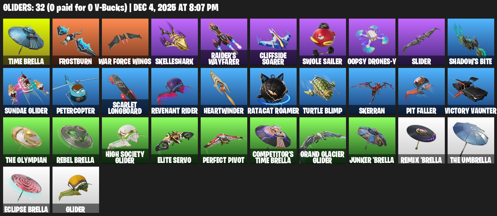 Time Brella, Frostburn, War Force Wings, Skelleshark, Raider’s Wayfarer, Cliffside Soarer, Swole Sailer, Oopsy Drones-y, Slider, Shadow’s Bite, Sundae Glider, Petercopter, Scarlet Longboard, Revenant Rider, Heartwinder, Ratacat Roamer, Turtle Blimp, Skerran, Pit Faller, Victory Vaunter