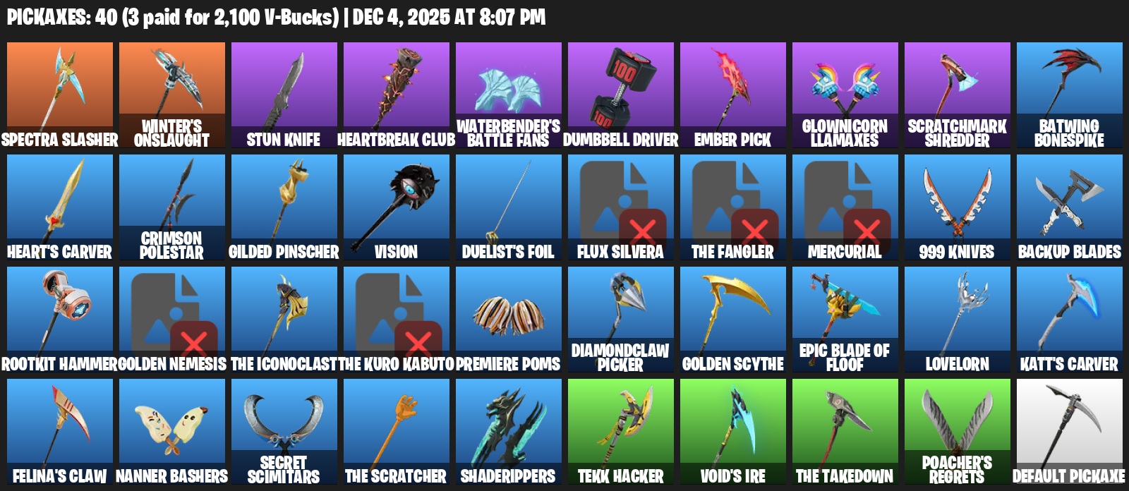 Winter’s Onslaught, Stun Knife, Waterbender’s Battle Fans, Dumbbell Driver, Ember Pick, Glownicorn Llamaxes, Scratchmark Shredder, Batwing Bonespike, Heart’s Carver, Crimson Polestar, Gilded Pinscher, Vision, Duelist’s Foil, Flux Silvera, The Fangler, Mercurial, 999 Knives, Backup Blades
