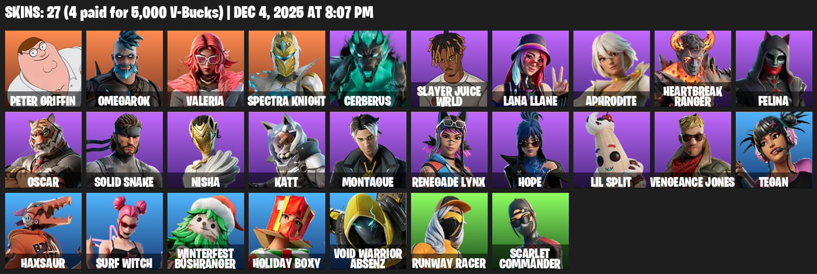 Peter Griffin, Omegarok, Valeria, Spectra Knight, Cerberus, Slayer Juice WRLD, Lana Llane, Aphrodite, Heartbreak Ranger, Felina, Oscar, Solid Snake, Nisha, Katt, Montague, Renegade Lynx, Hope, Lil Split, Vengeance Jones, Tegan