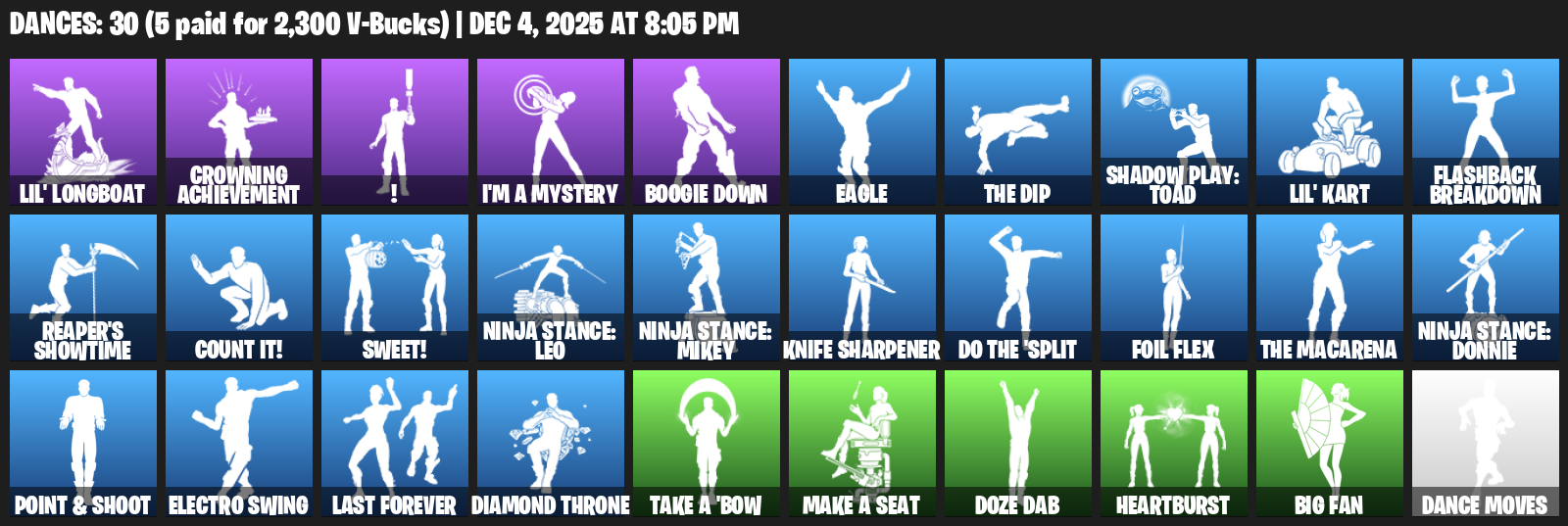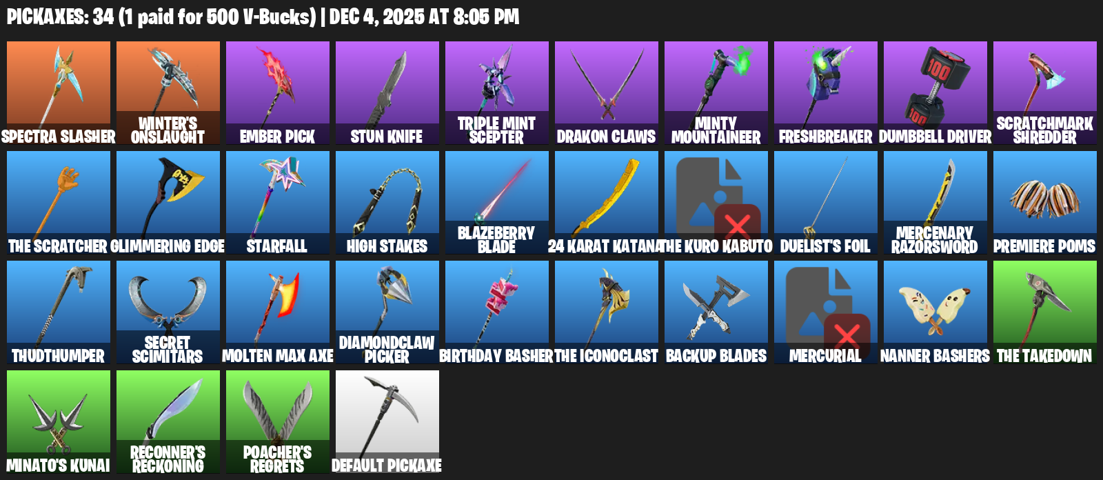 Winter’s Onslaught, Ember Pick, Stun Knife, Triple Mint Scepter, Freshbreaker, Dumbbell Driver, Scratchmark Shredder, The Scratcher, Glimmering Edge, Starfall, High Stakes, Blazeberry Blade, 24 Karat Katana, Duelist’s Foil, Mercenary Razorsword, Premiere Poms