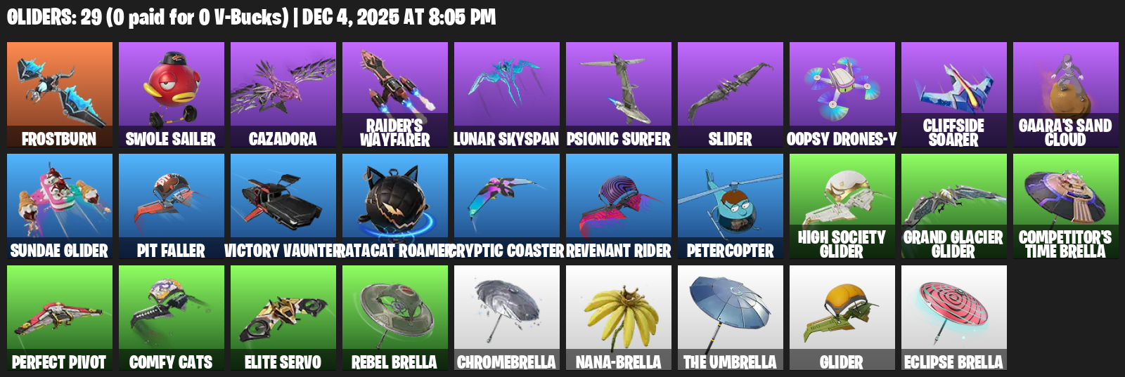 Frostburn, Swole Sailer, Cazadora, Raider’s Wayfarer, Lunar Skyspan, Psionic Surfer, Slider, Oopsy Drones-y, Cliffside Soarer, Gaara’s Sand Cloud, Sundae Glider, Pit Faller, Victory Vaunter, Ratacat Roamer, Cryptic Coaster, Revenant Rider, Petercopter, Competitor’s Time Brella