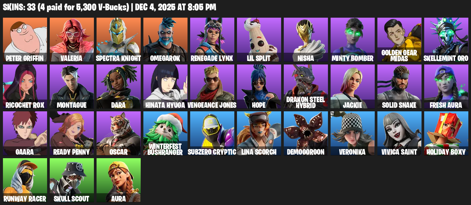 Peter Griffin, Valeria, Spectra Knight, Omegarok, Renegade Lynx, Lil Split, Nisha, Minty Bomber, Golden Gear Midas, Skellemint Oro, Ricochet Rox, Montague, Dara, Hinata Hyuga, Vengeance Jones, Hope, Drakon Steel Hybrid, Jackie, Solid Snake, Fresh Aura