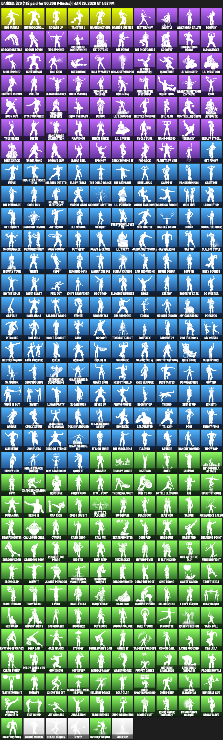 Hot Marat, Introducing…, Square Up, Rambunctious, Orange Justice, BeatzBunny, Lil’ T-6 Shuttle, Wakandan Salute, Boomin’, Arachrobatics, Boogie Down, Fire Spinner, Crowning Achievement, Scootin’, Distraction Dance, Glowsticks
