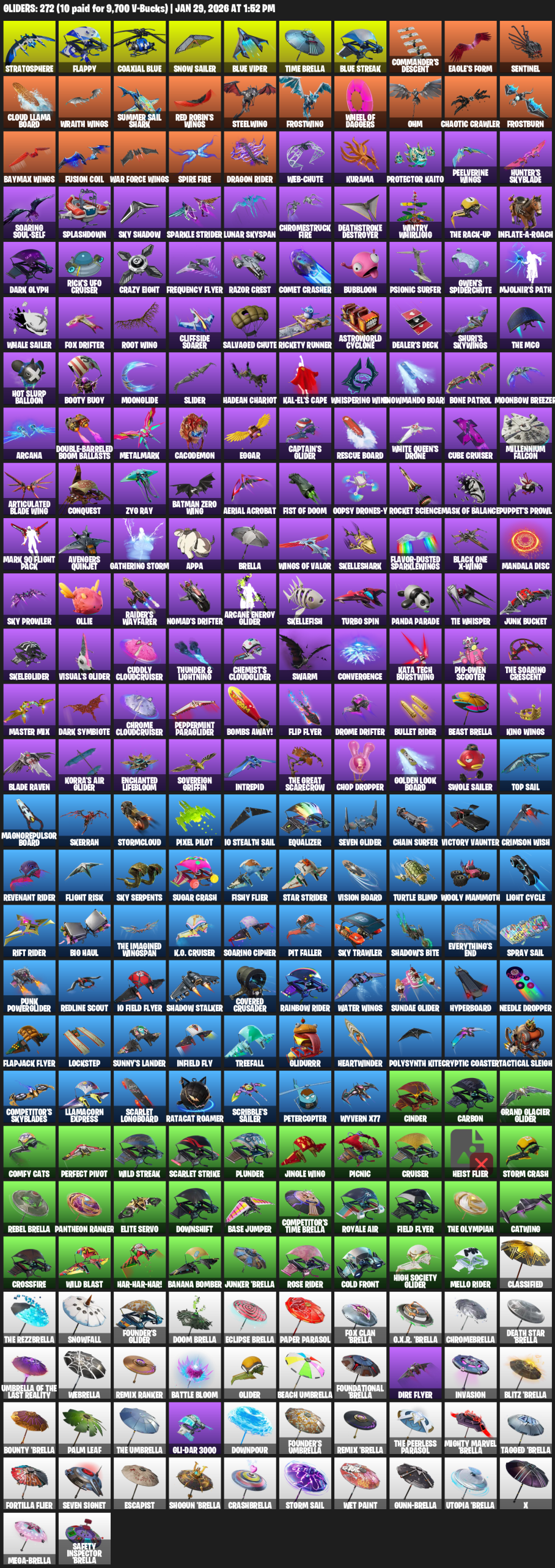 Stratosphere, Flappy, Snow Sailer, Time Brella, Commander’s Descent, Eagle’s Form, Sentinel, Wraith Wings, Summer Sail Shark, Steelwing, Frostwing, Wheel of Daggers, Ohm, Chaotic Crawler, Frostburn