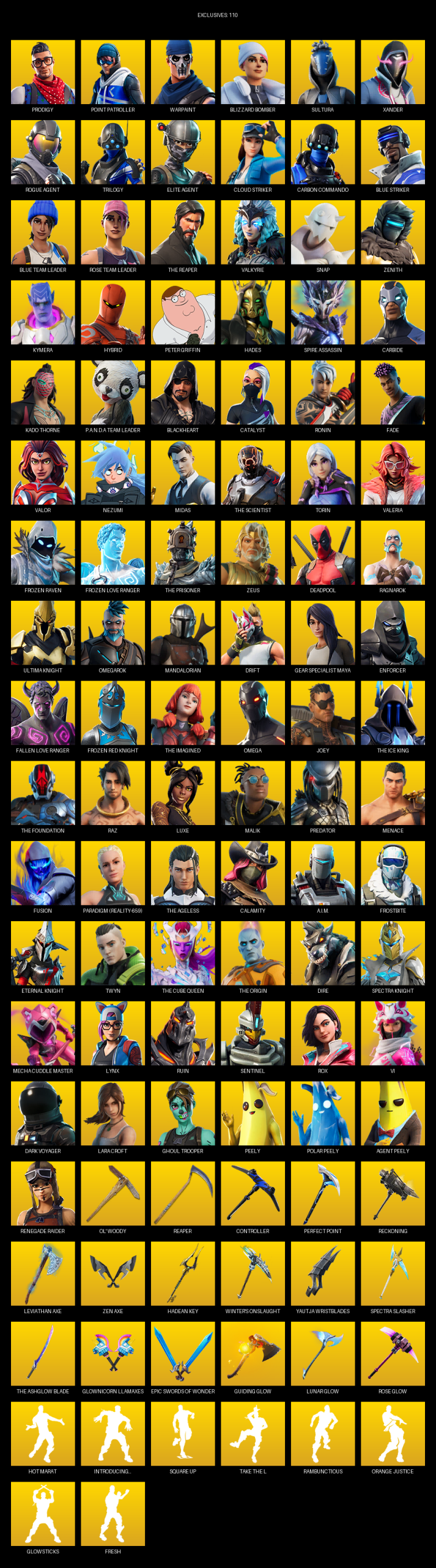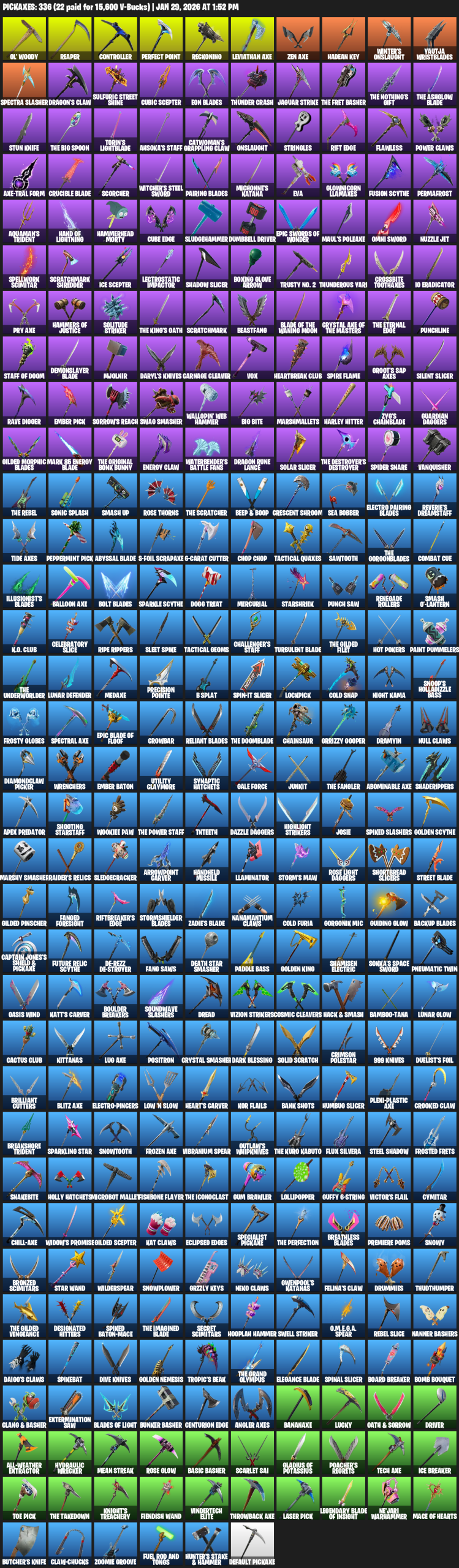 Leviathan Axe, Ol’ Woody, Controller, Reckoning, Hadean Key, Winter’s Onslaught, Yautja Wristblades, Spectra Slasher, Dragon’s Claw, Sulfuric Street Shine, Cubic Scepter, Eon Blades, Thunder Crash, Jaguar Strike
