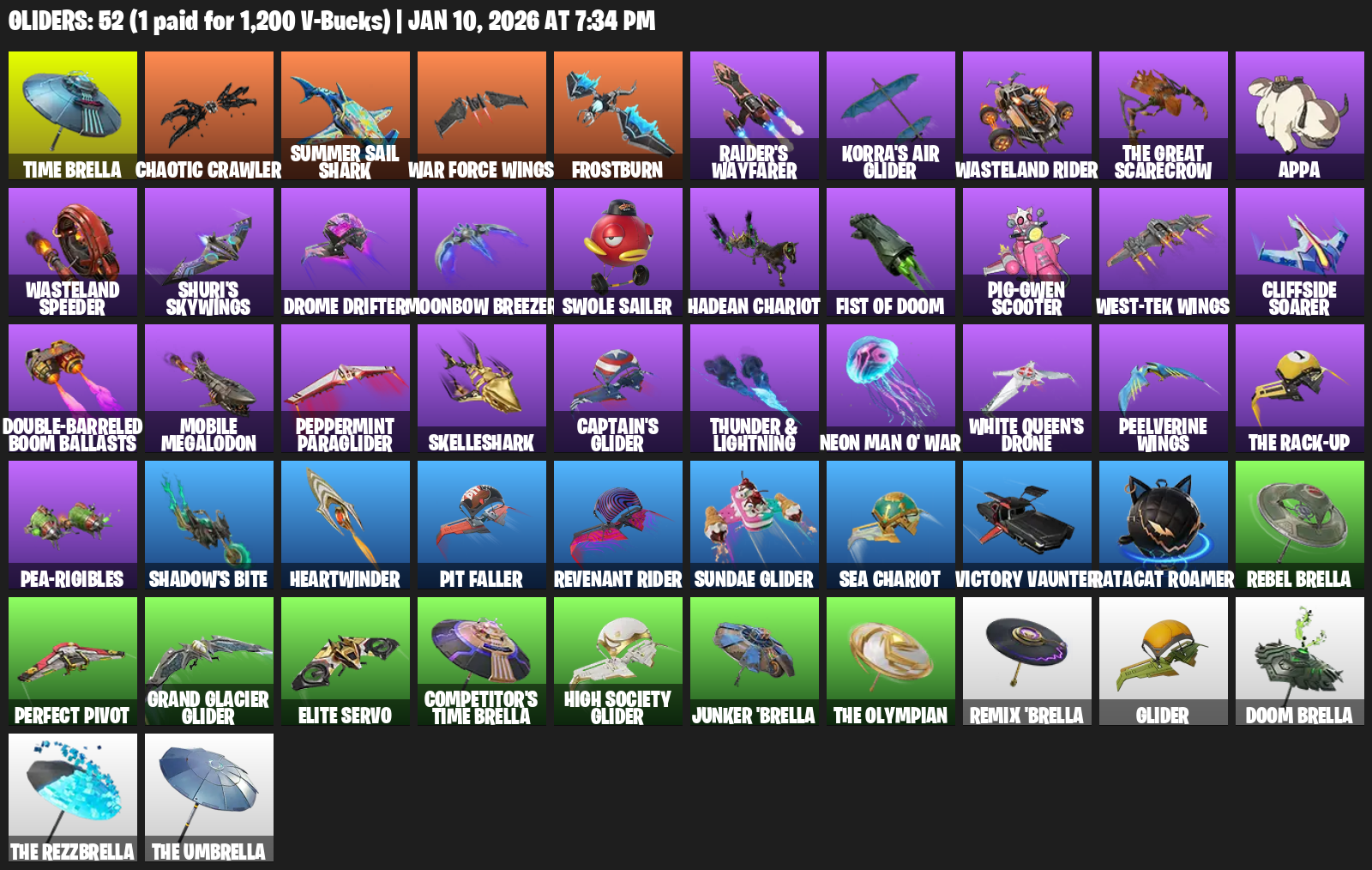 Time Brella, Chaotic Crawler, Summer Sail Shark, Frostburn, Raider’s Wayfarer, Korra’s Air Glider, Wasteland Rider, Appa, Shuri’s Skywings, Drome Drifter, Moonbow Breezer, Swole Sailer, Fist of Doom, Pig-Gwen Scooter, West-Tek Wings, Cliffside Soarer