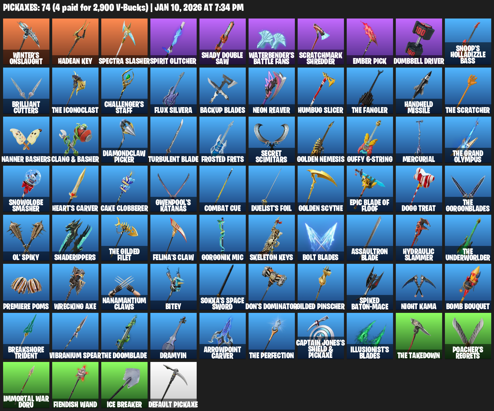 Winter’s Onslaught, Hadean Key, Spirit Glitcher, Shady Double Saw, Waterbender’s Battle Fans, Scratchmark Shredder, Ember Pick, Dumbbell Driver, Snoop’s Holladizzle Bass, Brilliant Cutters, The Iconoclast, Challenger’s Staff, Flux Silvera, Backup Blades, Neon Reaver, Humbug Slicer, Handheld Missile