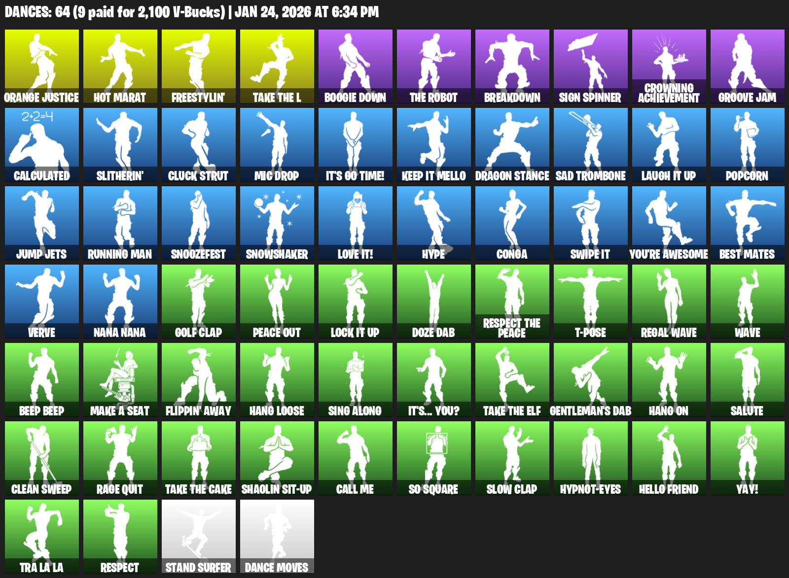 Hot Marat, Orange Justice, Freestylin’, Boogie Down, Breakdown, Sign Spinner, Crowning Achievement, Groove Jam, Calculated, Slitherin’, Cluck Strut, Mic Drop, It’s Go Time!, Keep It Mello, Dragon Stance, Sad Trombone, Popcorn
