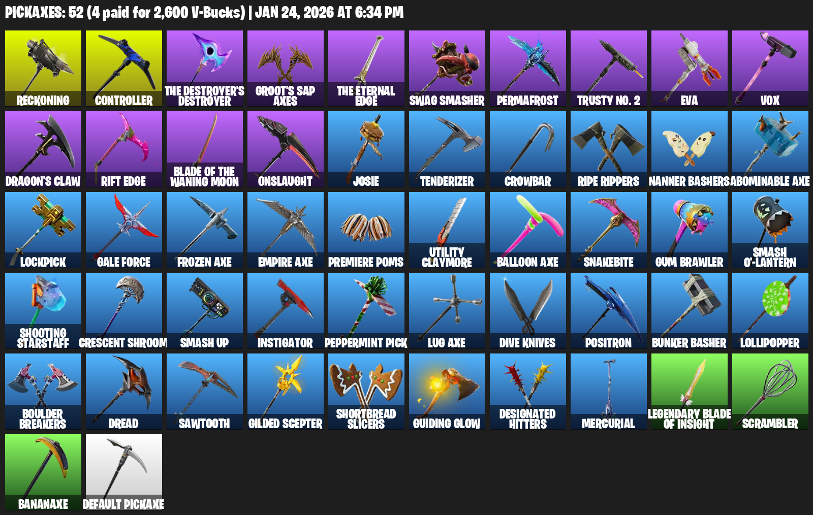 Reckoning, Controller, Groot’s Sap Axes, Swag Smasher, Permafrost, Trusty No. 2, EVA, Vox, Dragon’s Claw, Rift Edge, Onslaught, Josie, Tenderizer, Crowbar, Ripe Rippers, Nanner Bashers, Abominable Axe
