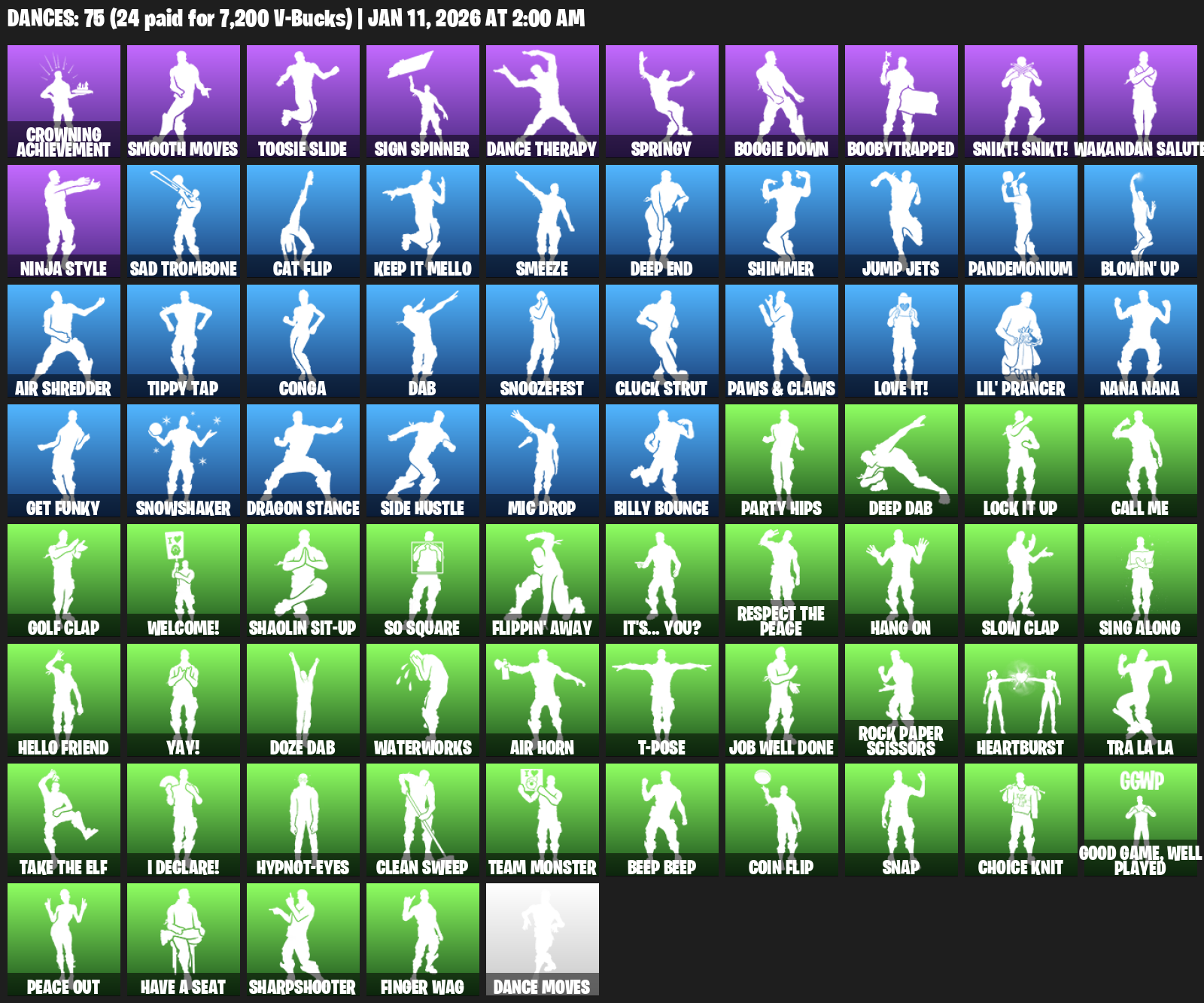 Crowning Achievement, Smooth Moves, Toosie Slide, Sign Spinner, Dance Therapy, Springy, Boogie Down, Boobytrapped, Snikt! Snikt!, Wakandan Salute, Ninja Style, Sad Trombone, Cat Flip, Keep It Mello, Smeeze, Deep End, Shimmer, Jump Jets, Pandemonium, Blowin’ Up