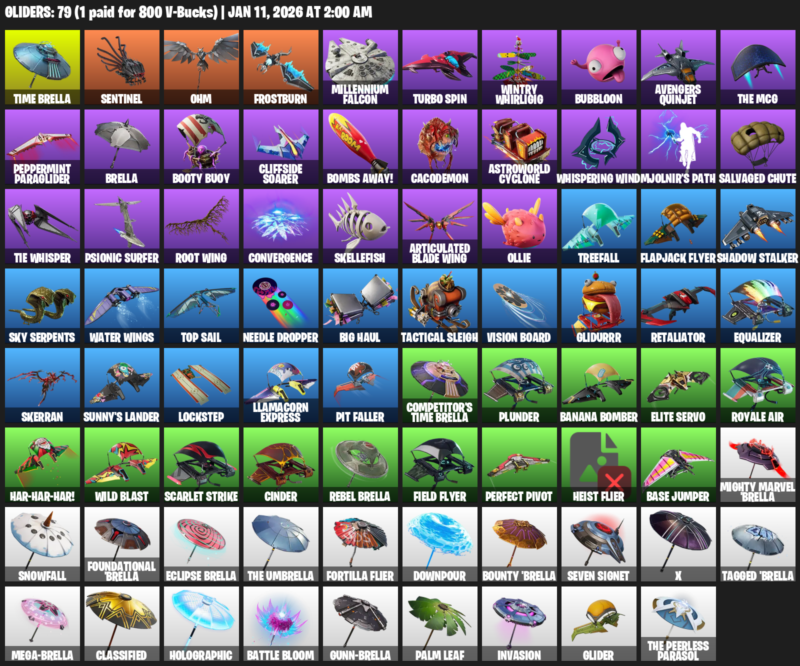 Time Brella, Ohm, Frostburn, Millennium Falcon, Turbo Spin, Wintry Whirligig, Bubbloon, Avengers Quinjet, Peppermint Paraglider, Booty Buoy, Cliffside Soarer, Bombs Away!, Cacodemon, Astroworld Cyclone, Whispering Wind, Mjolnir’s Path, Salvaged Chute