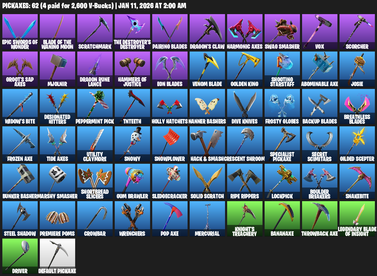 Blade of the Waning Moon, Scratchmark, Pairing Blades, Dragon’s Claw, Harmonic Axes, Swag Smasher, Vox, Scorcher, Mjolnir, Dragon Rune Lance, Golden King, Shooting Starstaff, Abominable Axe, Josie