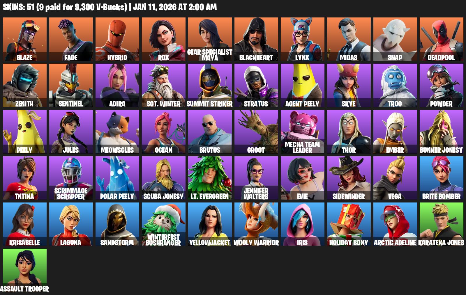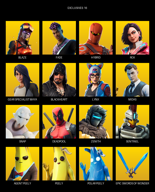 Gear Specialist Maya, Blaze, Fade, Hybrid, Rox, Blackheart, Lynx, Midas, Snap, Deadpool, Zenith, Sentinel, Adira, Sgt. Winter, Summit Striker, Stratus, Agent Peely, Skye, Trog, Powder