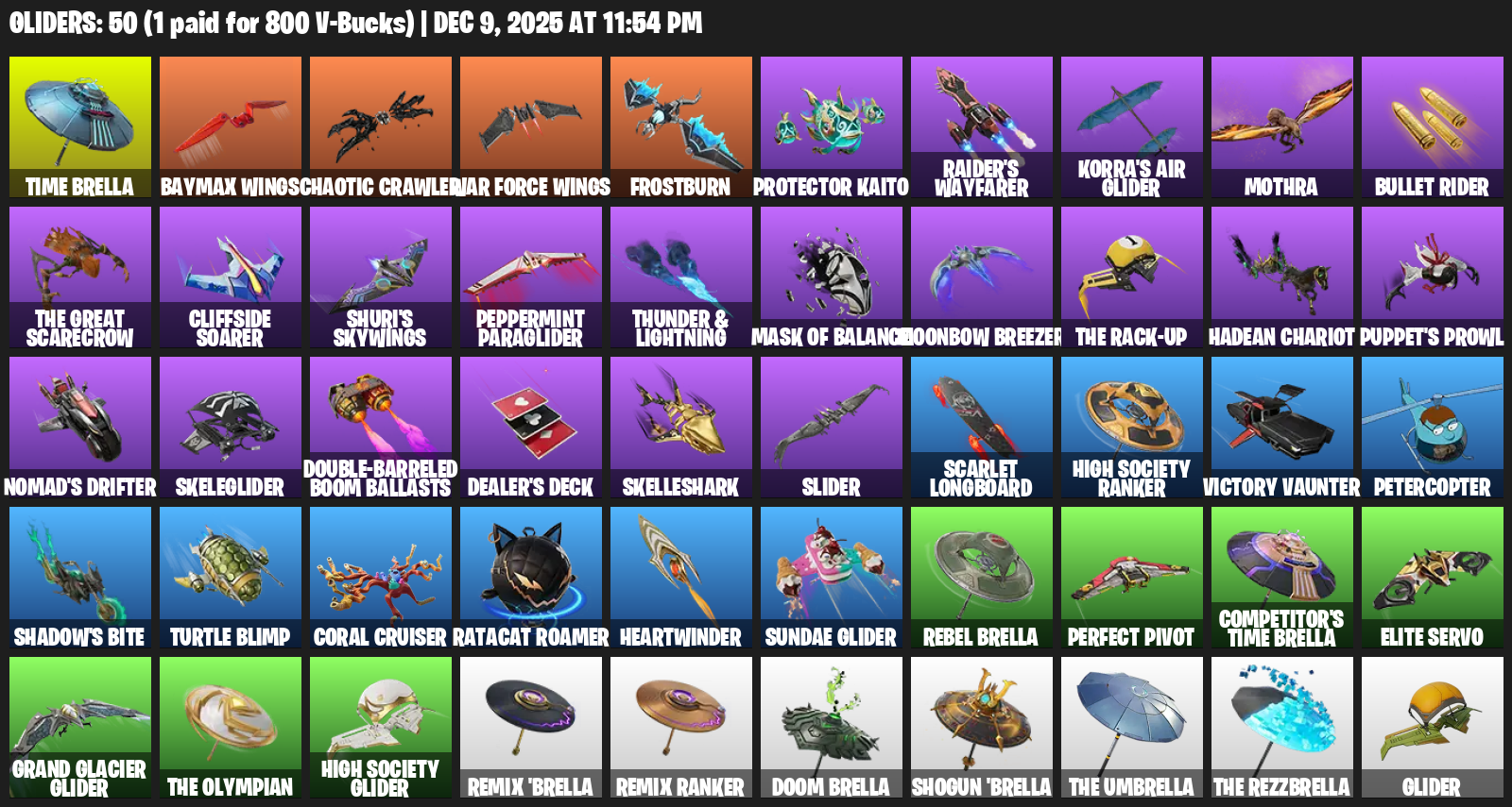 Time Brella, Baymax Wings, Chaotic Crawler, Frostburn, Protector Kaito, Raider’s Wayfarer, Korra’s Air Glider, Mothra, Bullet Rider, Cliffside Soarer, Shuri’s Skywings, Peppermint Paraglider, Thunder & Lightning, Mask of Balance, Moonbow Breezer, Puppet’s Prowl