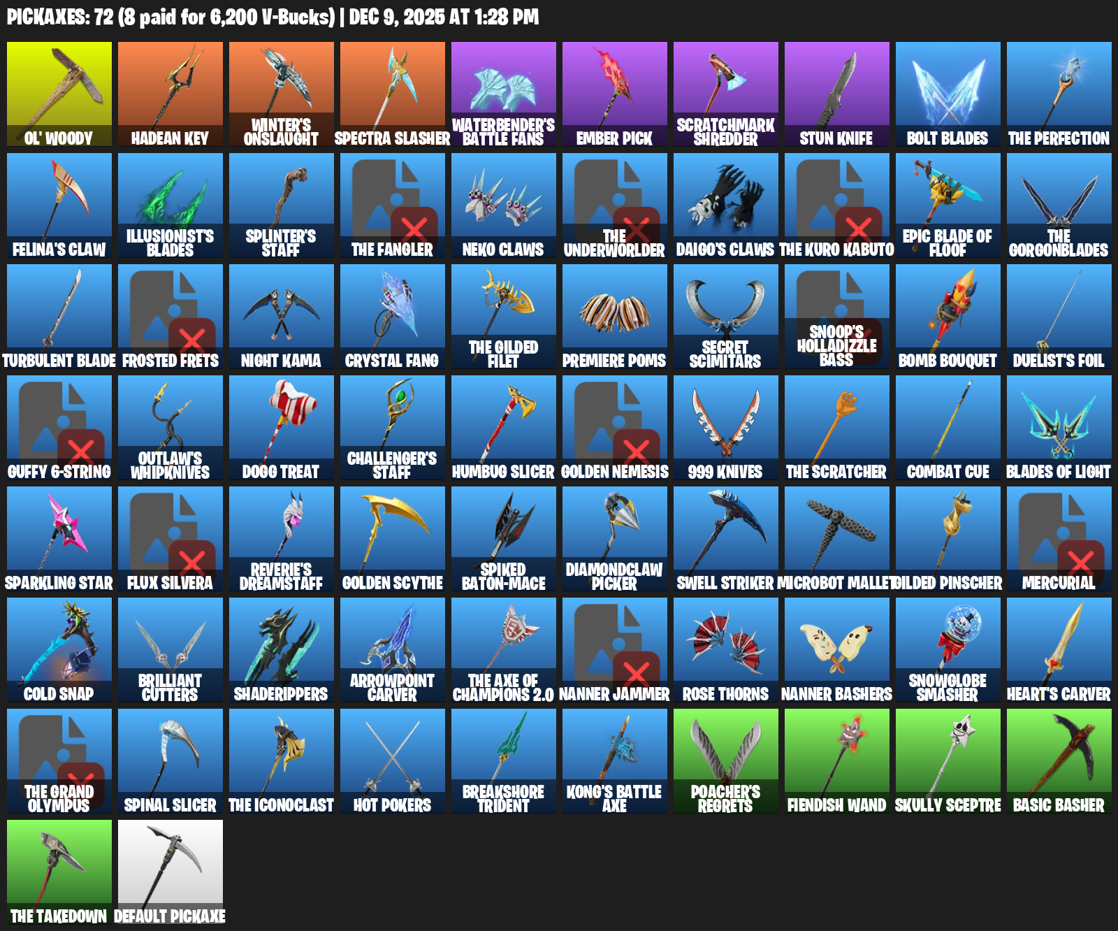 Ol’ Woody, Hadean Key, Winter’s Onslaught, Waterbender’s Battle Fans, Ember Pick, Scratchmark Shredder, Stun Knife, Bolt Blades, The Perfection, Felina’s Claw, Splinter’s Staff, Neko Claws