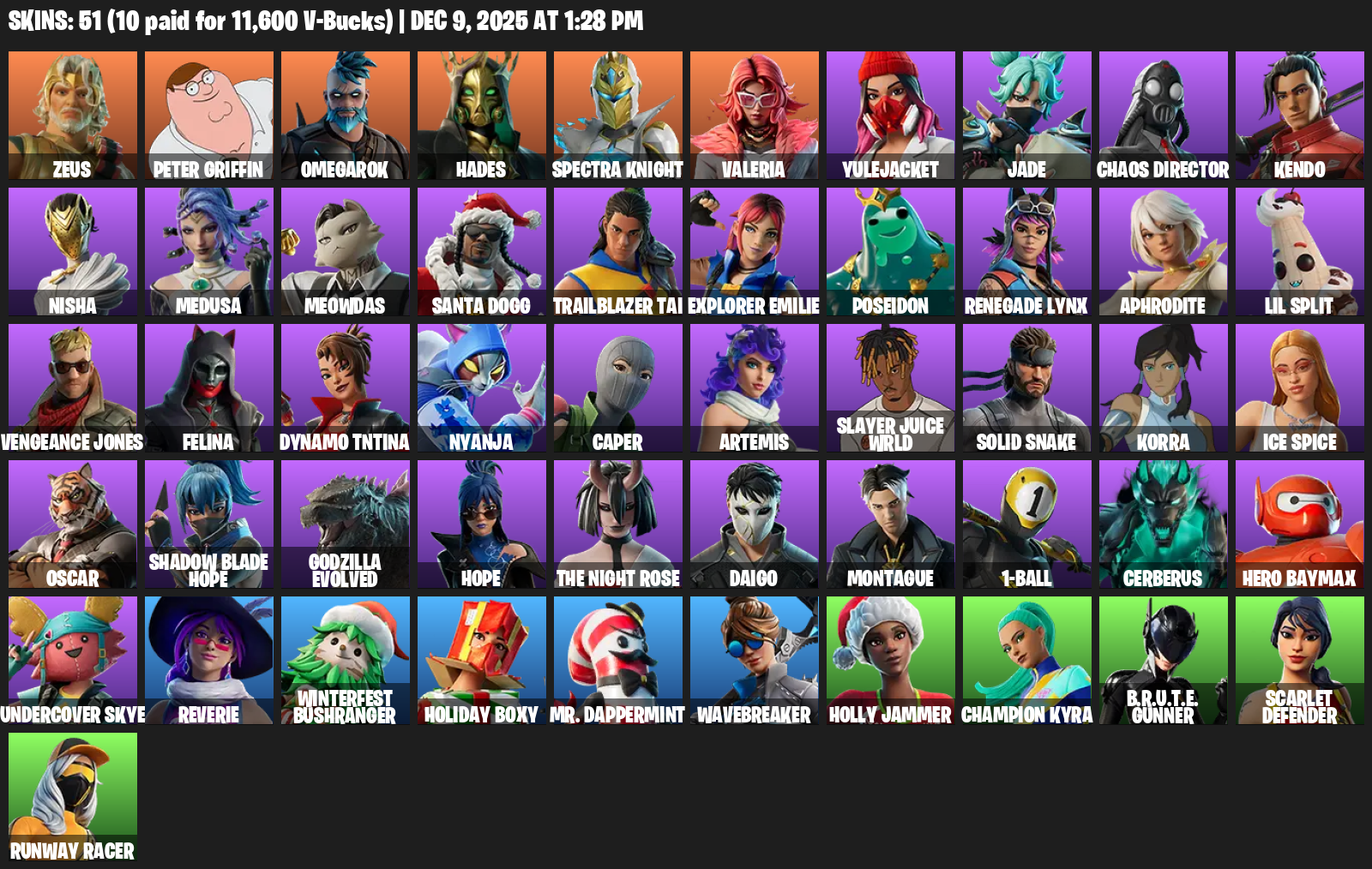 Zeus, Peter Griffin, Omegarok, Hades, Spectra Knight, Valeria, Yulejacket, Jade, Chaos Director, Kendo, Nisha, Medusa, Meowdas, Santa Dogg, Trailblazer Tai, Explorer Emilie, Poseidon, Renegade Lynx, Aphrodite, Lil Split