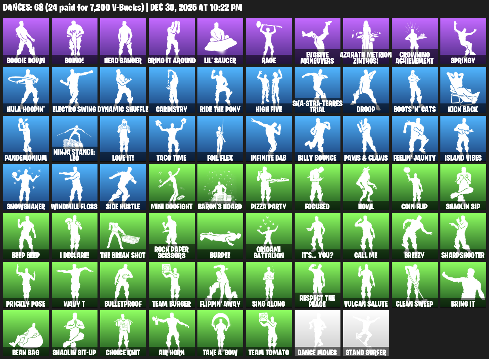 Boogie Down, Boing!, Head Banger, Bring it around, Lil’ Saucer, Rage, Evasive Maneuvers, Azarath Metrion Zinthos!, Crowning Achievement, Springy, Hula Hoopin’, Electro Swing, Dynamic Shuffle, Cardistry, High Five, Ska-stra-terrestrial, Droop, Boots ‘n’ Cats, Kick Back