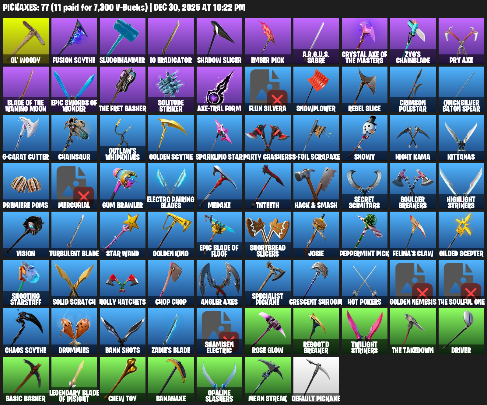 Ol’ Woody, Sludgehammer, IO Eradicator, Shadow Slicer, Ember Pick, A.R.G.U.S. Sabre, Crystal Axe of the Masters, Zyg’s Chainblade, Solitude Striker, Flux Silvera, Snowplower, Rebel Slice, Crimson Polestar, Quicksilver Baton Spear