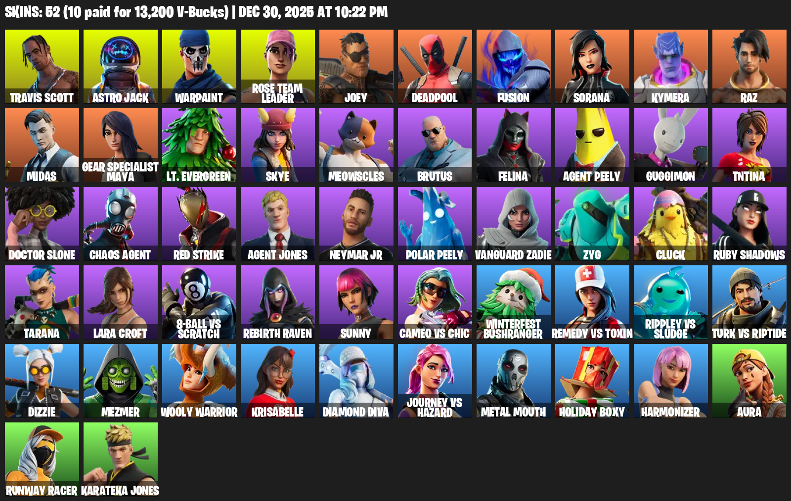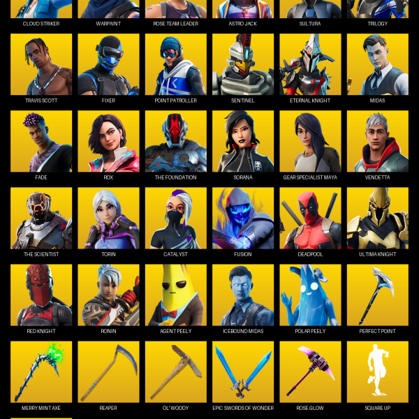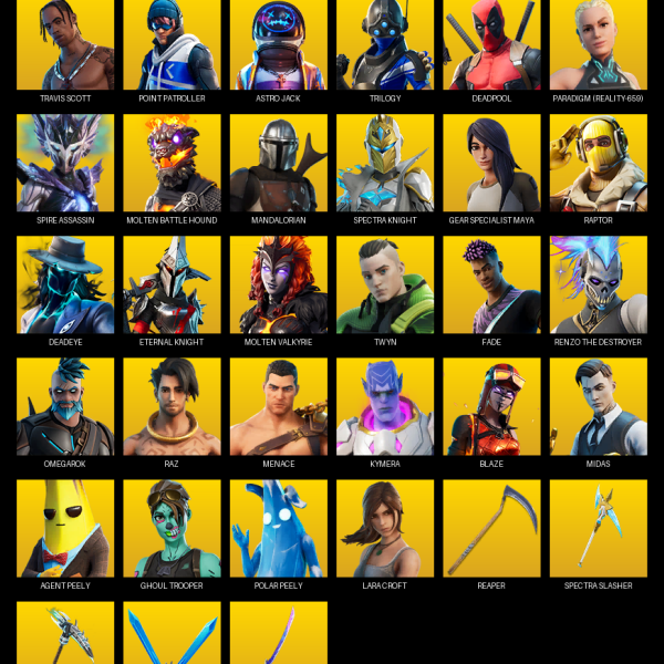 Travis Scott, Gear Specialist Maya, Lara Croft, Astro Jack, Warpaint, Rose Team Leader, Joey, Deadpool, Fusion, Sorana, Kymera, Raz, Midas, Lt. Evergreen, Skye, Meowscles, Brutus, Felina, Agent Peely, Guggimon