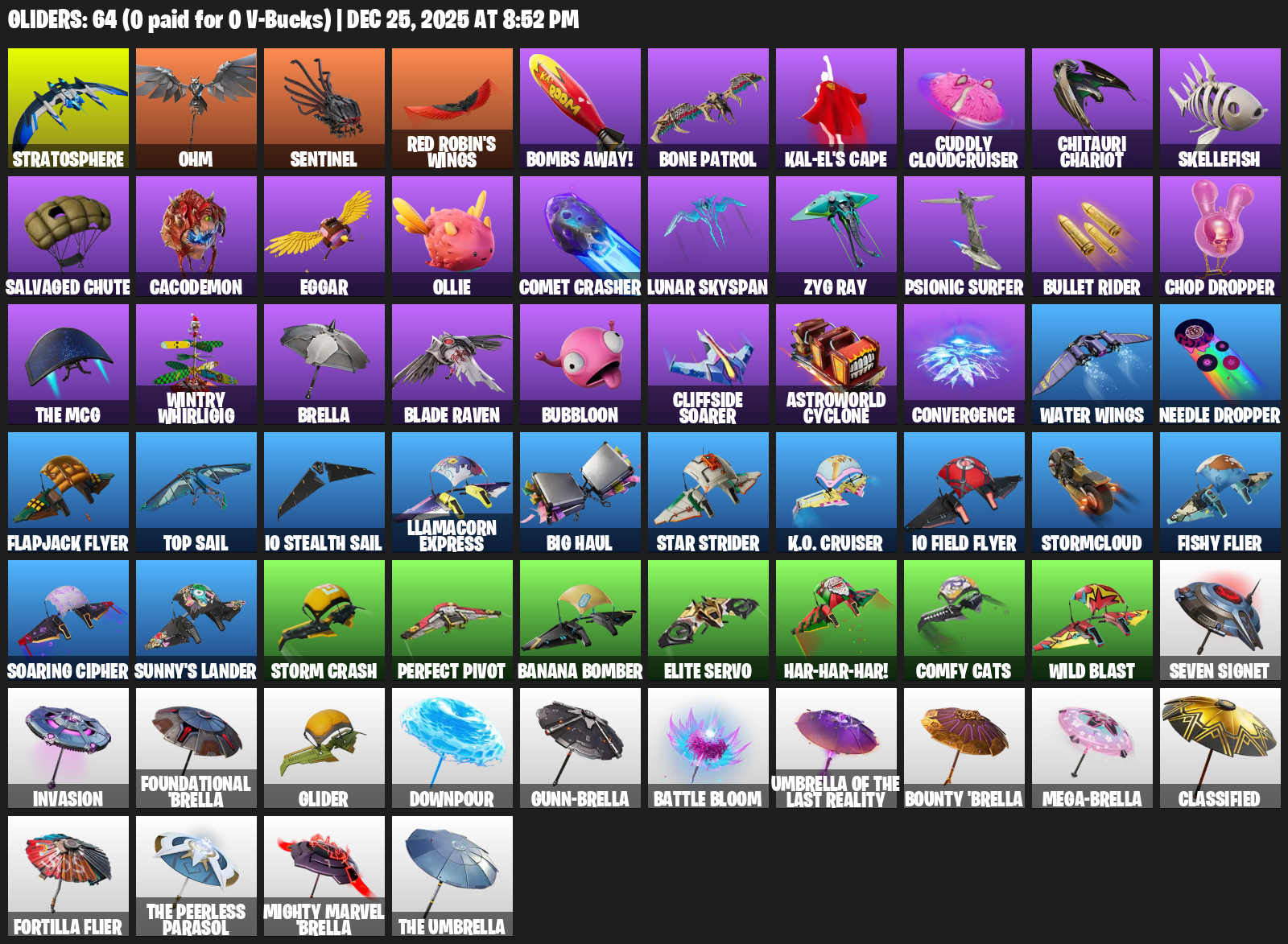 Stratosphere, Ohm, Sentinel, Red Robin’s Wings, Bombs Away!, Bone Patrol, Kal-El’s Cape, Cuddly Cloudcruiser, Chitauri Chariot, Skellefish, Salvaged Chute, Cacodemon, Eggar, Ollie, Comet Crasher, Lunar Skyspan, Psionic Surfer, Bullet Rider, Chop Dropper