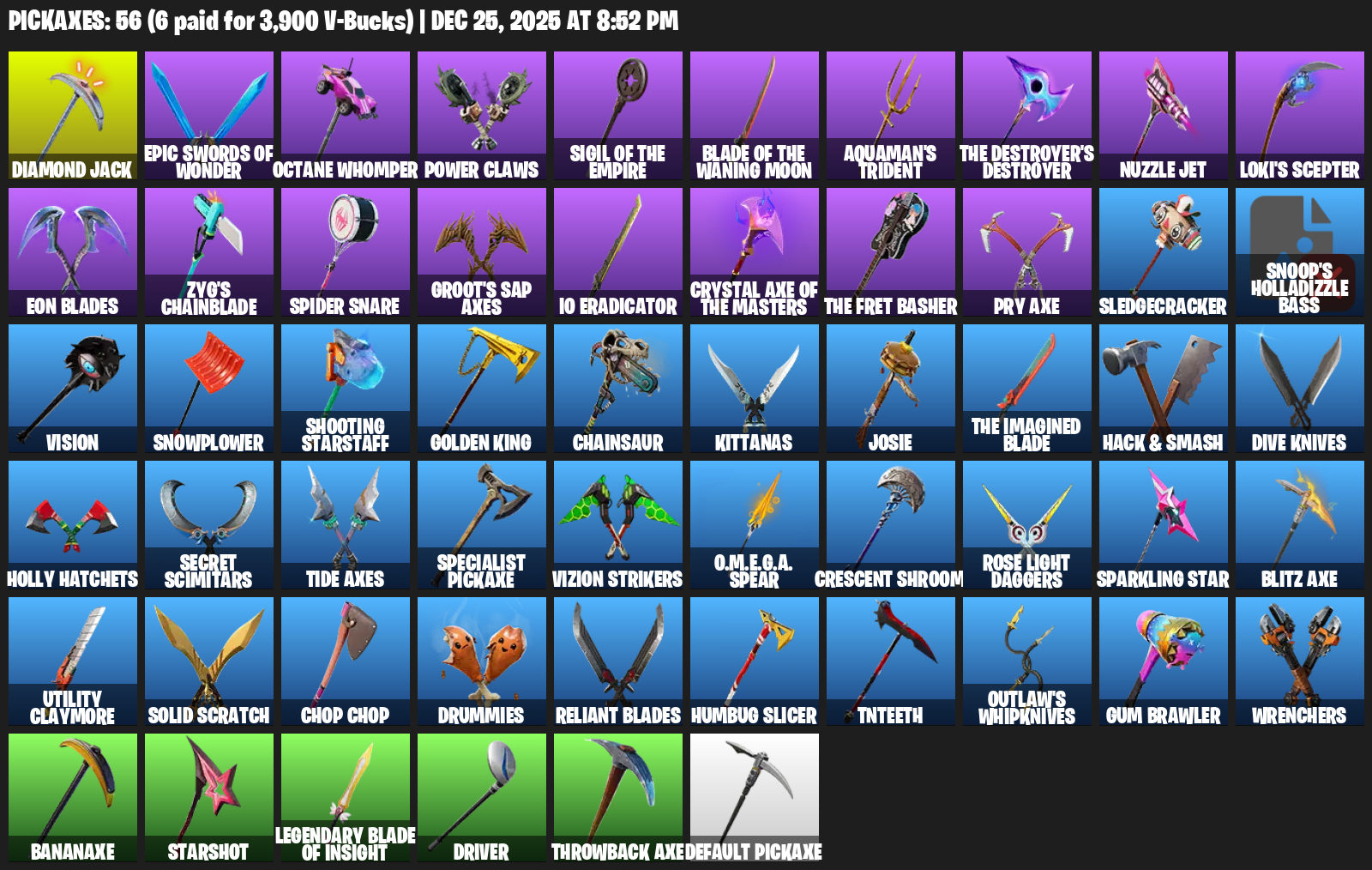 Octane Whomper, Power Claws, Sigil of the Empire, Aquaman’s Trident, Nuzzle Jet, Loki’s Scepter, Eon Blades, Zyg’s Chainblade, Spider Snare, Groot’s Sap Axes, IO Eradicator, Pry Axe, Sledgecracker, Snoop’s Holladizzle Bass