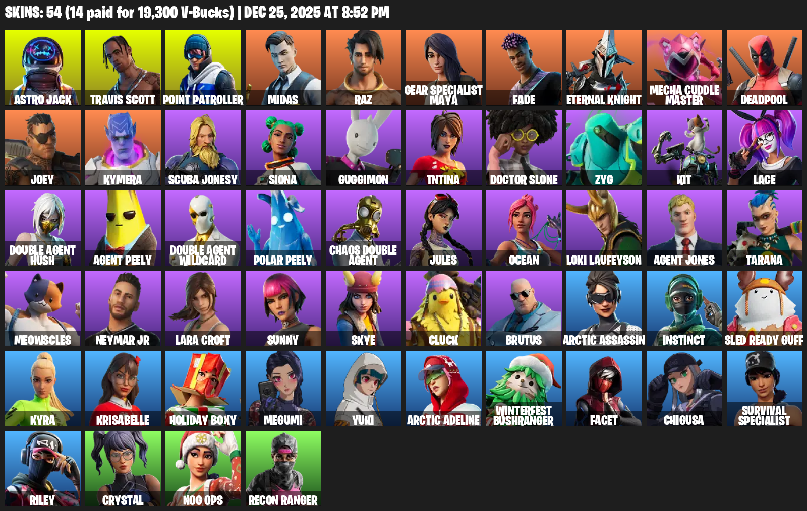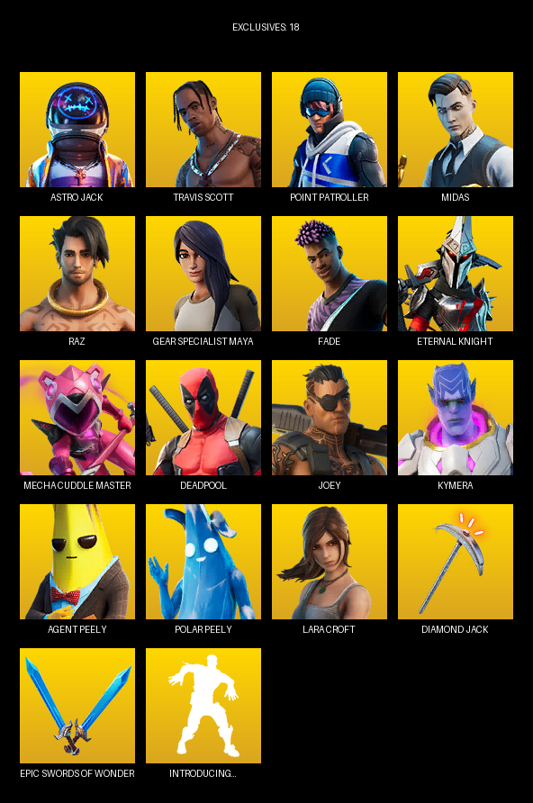Travis Scott, Point Patroller, Gear Specialist Maya, Lara Croft, Astro Jack, Midas, Raz, Fade, Eternal Knight, Mecha Cuddle Master, Deadpool, Joey, Kymera, Scuba Jonesy, Siona, Guggimon, TNTina, Doctor Slone, Zyg, Kit