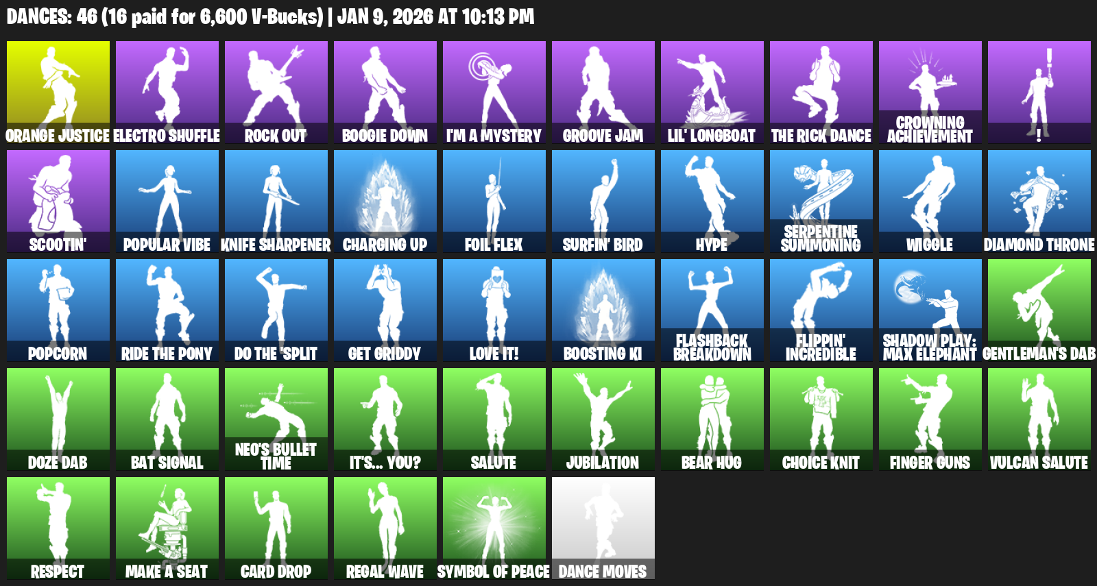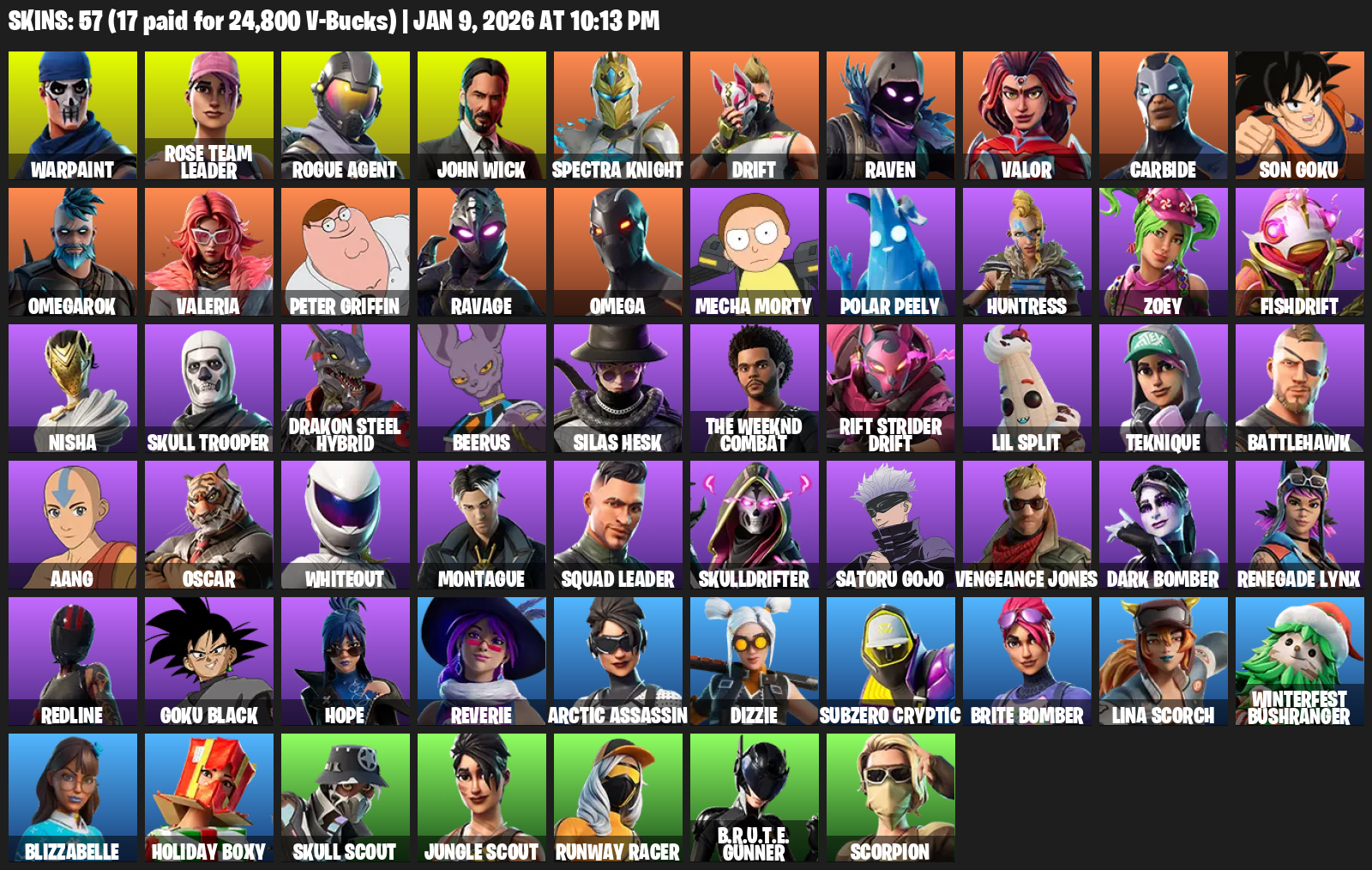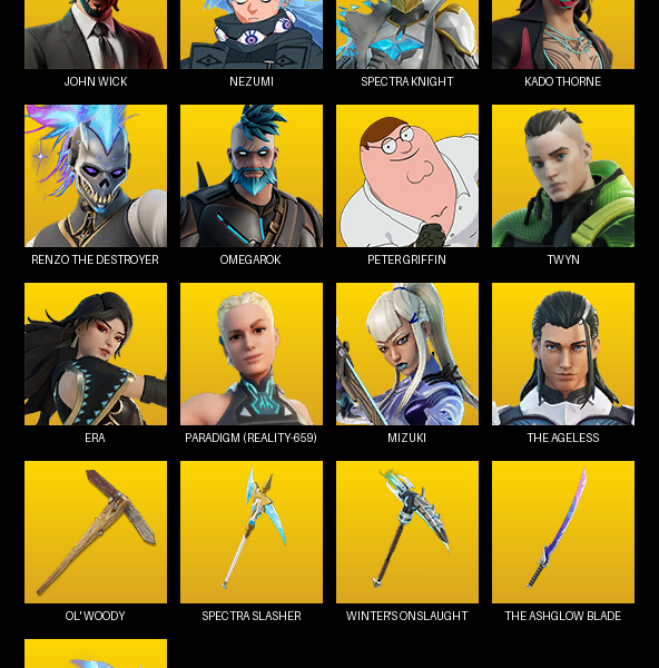 Omega, Warpaint, Rose Team Leader, Rogue Agent, John Wick, Spectra Knight, Drift, Raven, Valor, Carbide, Son Goku, Omegarok, Valeria, Peter Griffin, Ravage, Mecha Morty, Polar Peely, Huntress, Zoey, Fishdrift