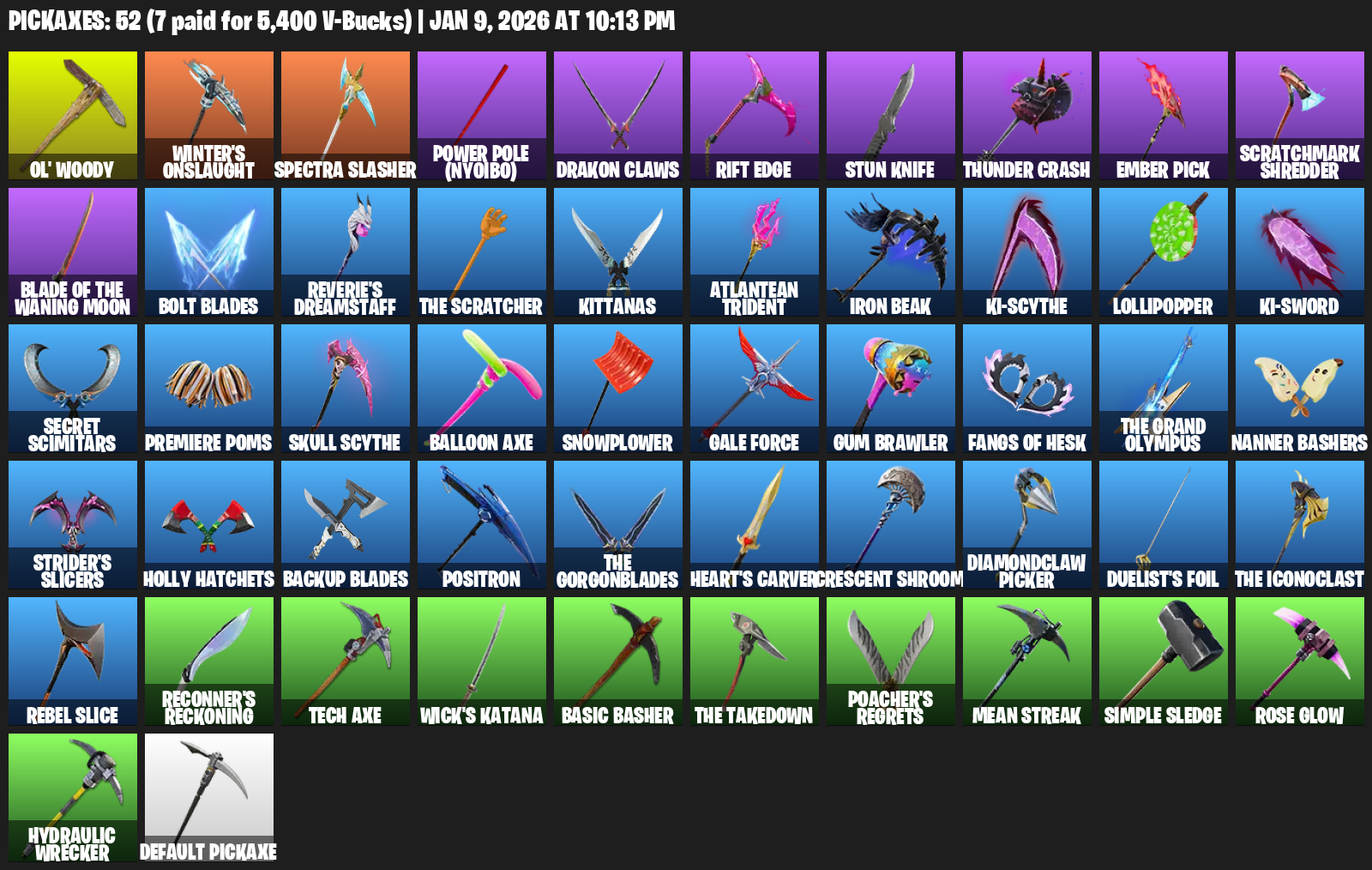 Ol’ Woody, Winter’s Onslaught, Power Pole (Nyoibo), Drakon Claws, Rift Edge, Stun Knife, Thunder Crash, Ember Pick, Scratchmark Shredder, Blade of the Waning Moon, Bolt Blades, Reverie’s Dreamstaff, Kittanas, Atlantean Trident, Iron Beak, Ki-Scythe, Lollipopper