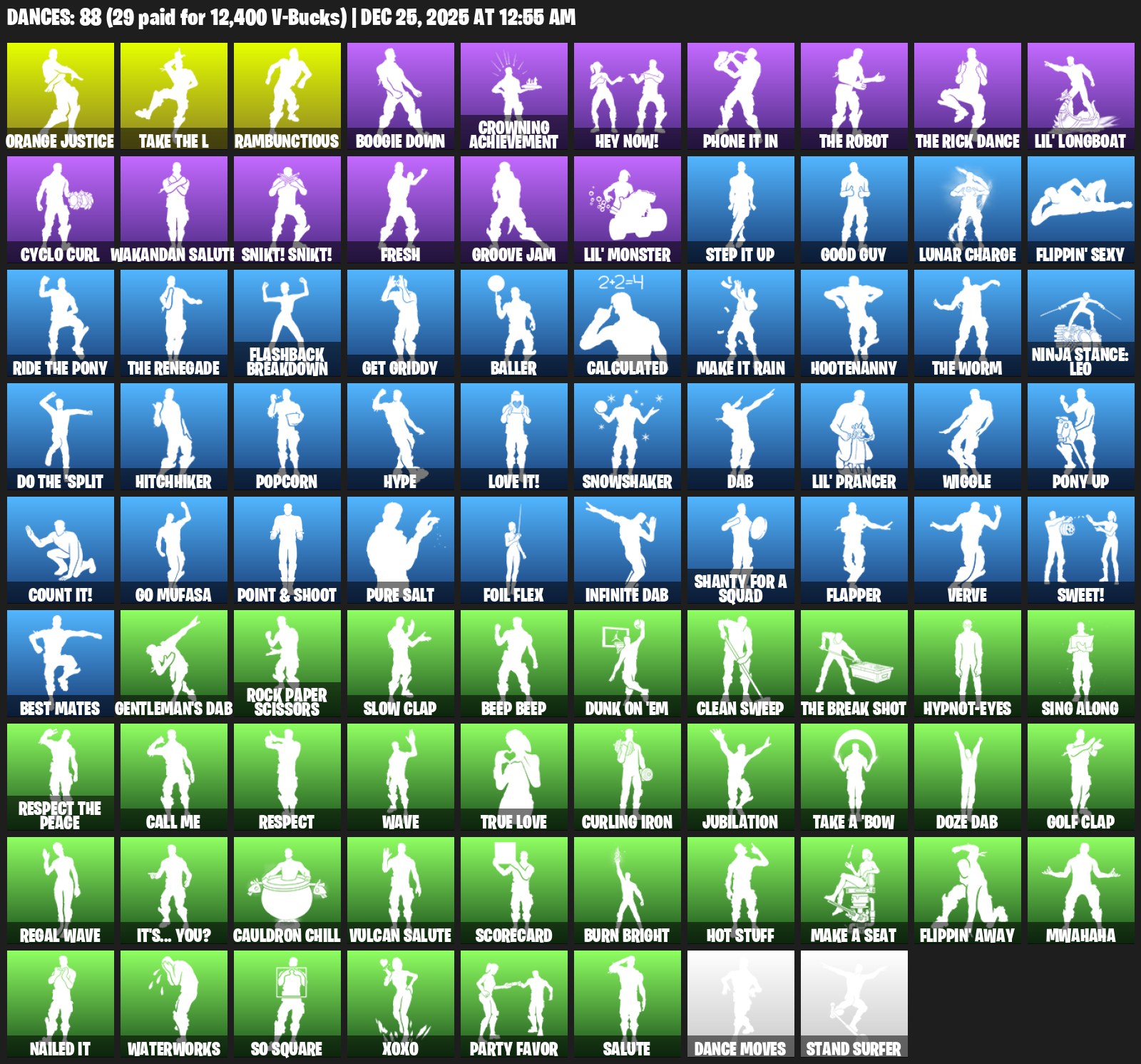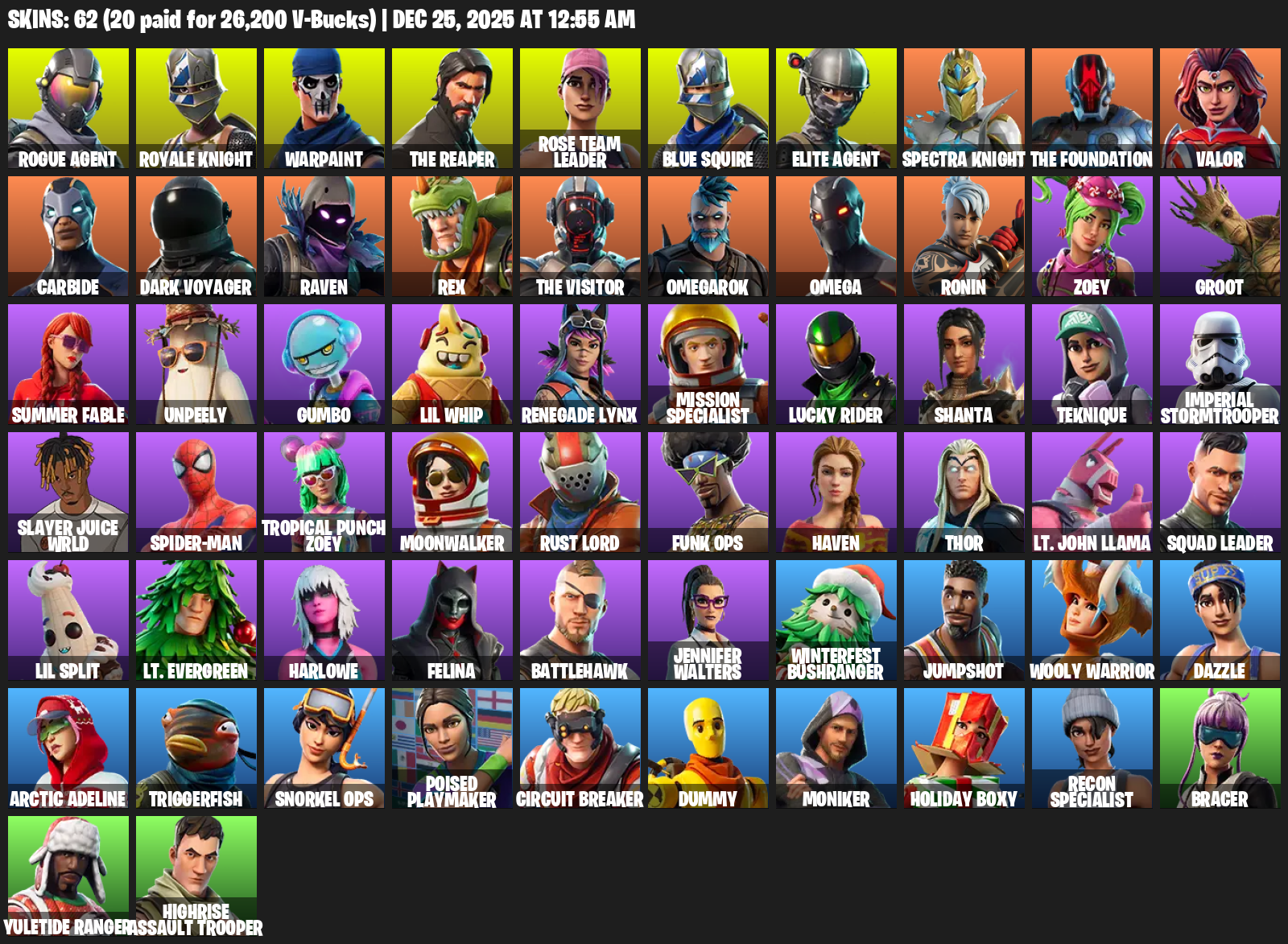 Royale Knight, The Reaper, Blue Squire, Elite Agent, Omega, Warpaint, Rose Team Leader, Valor, Carbide, Dark Voyager, Raven, Rex, Omegarok, Ronin, Zoey, Groot