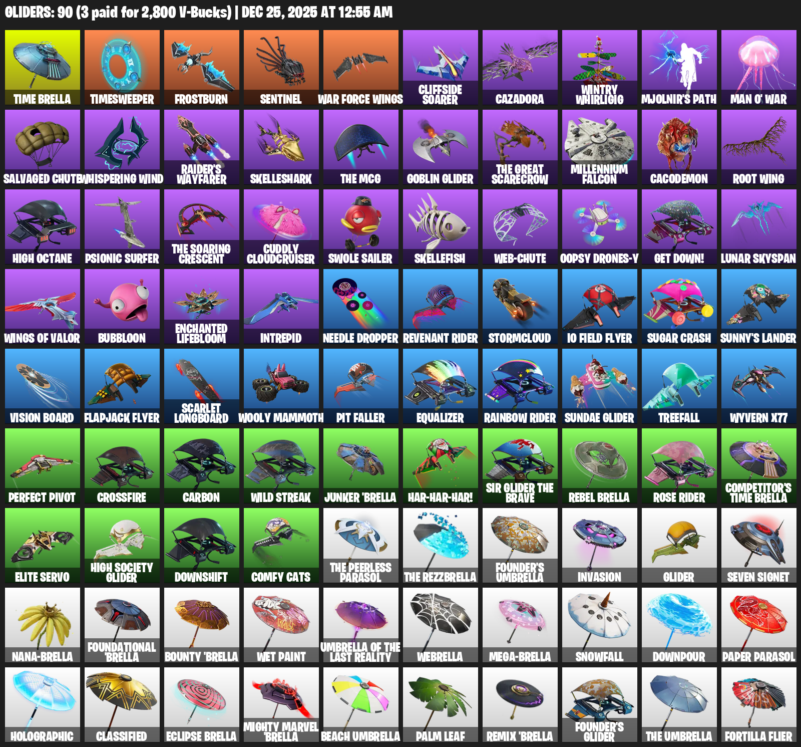 Time Brella, Timesweeper, Frostburn, Sentinel, War Force Wings, Cliffside Soarer, Cazadora, Wintry Whirligig, Mjolnir’s Path, Salvaged Chute, Whispering Wind, Raider’s Wayfarer, Skelleshark, Goblin Glider, Millennium Falcon, Cacodemon, Root Wing