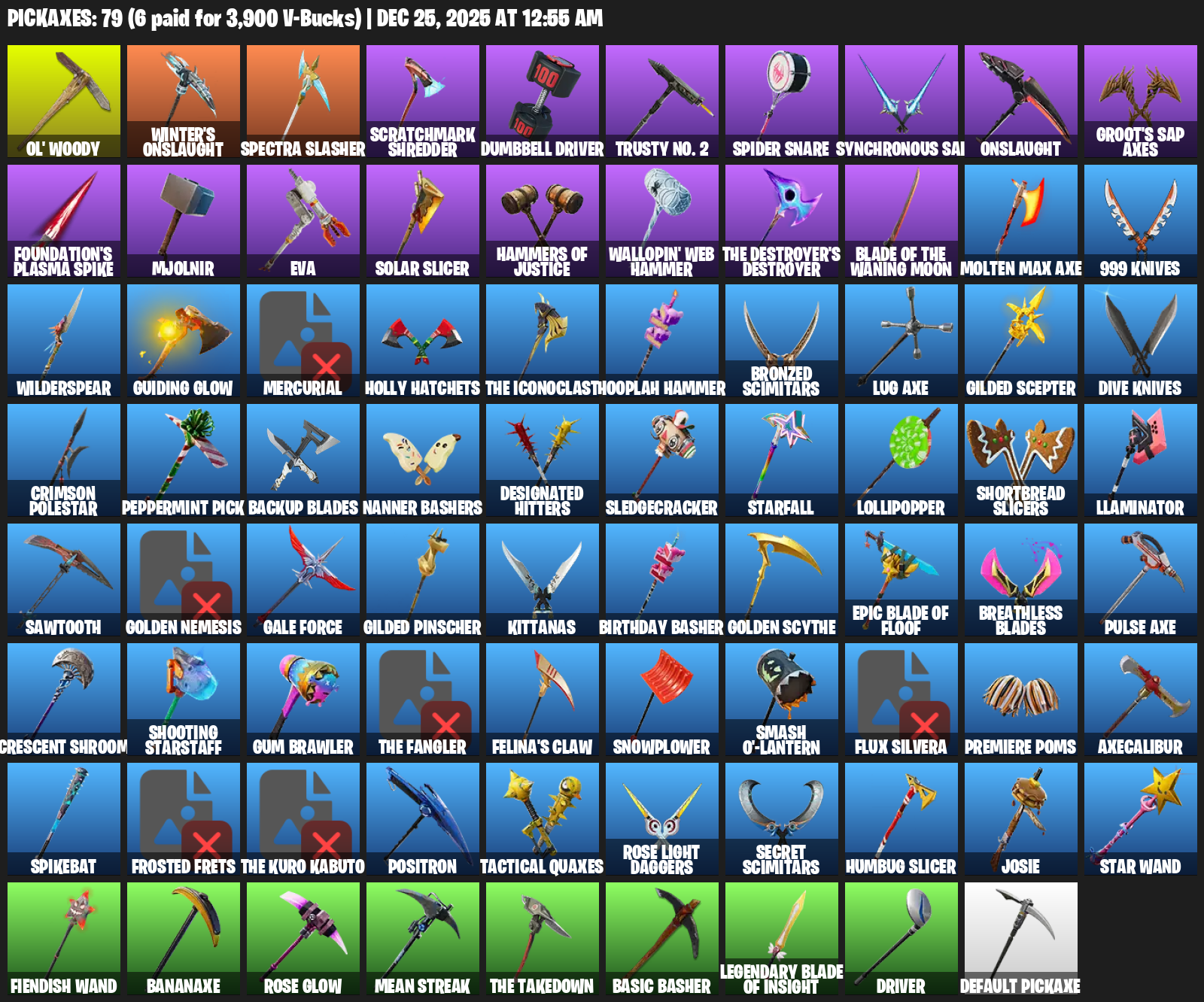 Ol’ Woody, Winter’s Onslaught, Spectra Slasher, Scratchmark Shredder, Dumbbell Driver, Trusty No. 2, Spider Snare, Synchronous Sai, Groot’s Sap Axes, Foundation’s Plasma Spike, Mjolnir, EVA, Solar Slicer, Hammers of Justice, Wallopin’ Web Hammer, Molten Max Axe, 999 Knives