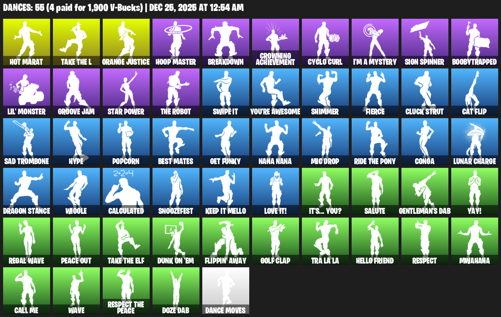 Hot Marat, Orange Justice, Hoop Master, Breakdown, Crowning Achievement, Cyclo Curl, I’m a Mystery, Sign Spinner, Boobytrapped, Lil’ Monster, Groove Jam, Star Power, Swipe It, You’re Awesome, Shimmer, Fierce, Cluck Strut, Cat Flip