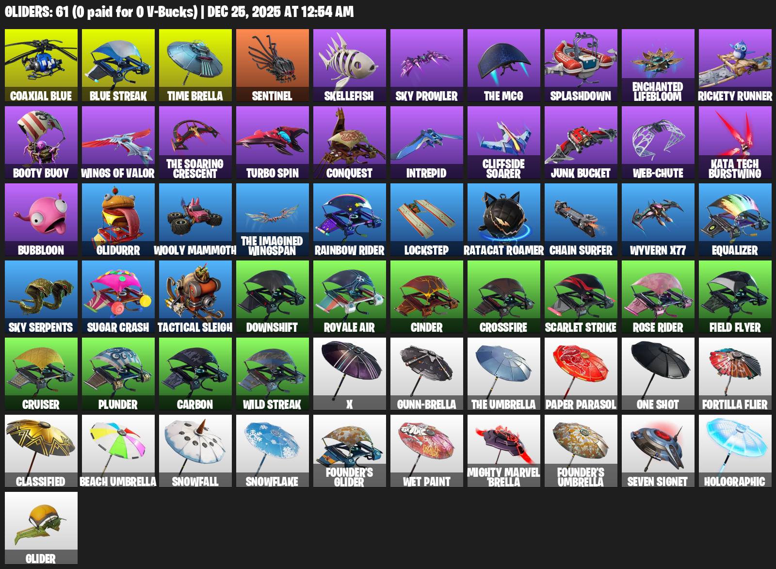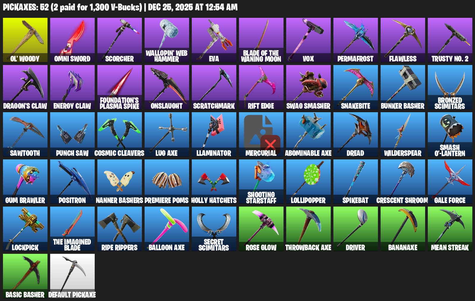 Ol’ Woody, Omni Sword, Scorcher, Wallopin’ Web Hammer, EVA, Vox, Permafrost, Flawless, Trusty No. 2, Dragon’s Claw, Foundation’s Plasma Spike, Onslaught, Scratchmark, Rift Edge, Swag Smasher, Snakebite, Bunker Basher, Bronzed Scimitars